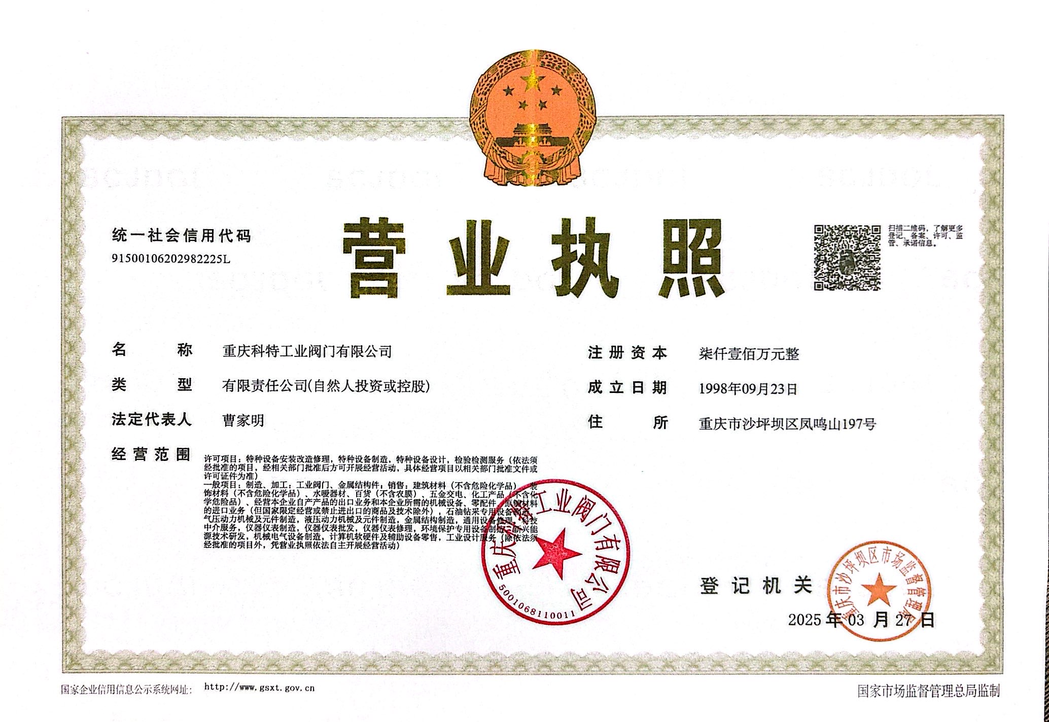 重庆科特工业阀门有限公司位于重庆市沙坪坝凤鸣山,是一家具有特种设备生产制造(压力管道元件)许可证资质的专业生产油气集输及石油炼化工业用阀门的股份制企业。自98年成立以来,公司专注于油气集输、炼化工业特种阀门的研制、开发与制造;目前,公司已拥有11项专利技术,3个国家级重点推广新产品,为我国油气集输、石油化工行业特种阀门的国产化作出了突出贡献。公司占地面积26000多平方米,拥有现代化标准厂房、研发中心、加工中心和检测中心,是重庆市高新技术企业