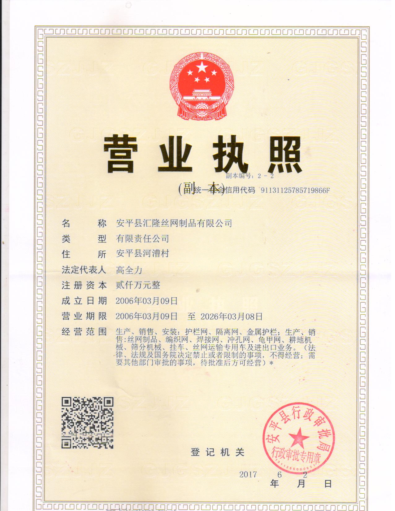 安平县汇隆丝网制品有限公司,创建于1999年6月(原安平县汇隆丝网厂),2006年更名为安平县汇隆丝网制品有限公司.公司位于国家级丝网产品生产基地,是一家以生产经营各种金属焊接网,金属编织网,金属冲板网及网类精加工制品为主的生产研发型企业.