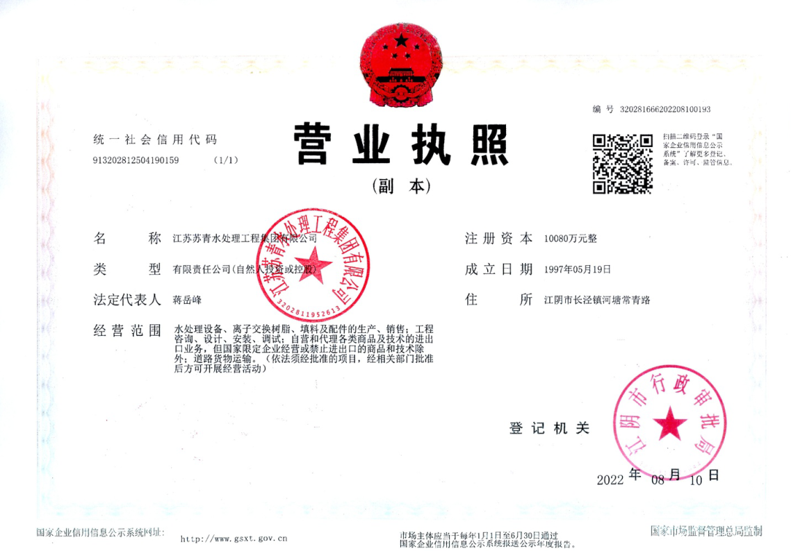 苏青集团(原江阴市有机化工厂)创建于1970年,近四十年来一直是中国最大、最强的离子交换树脂和特种树脂生产企业,又是新、特、专、异树脂的研发基地、离子交换树脂国家标准工作组、中国离子交换树脂副理事长单位。45余年来公司一直从事离子交换树脂、填料、交换器设备的研究、开发、设计、制造及工程安装调试。公司先后通过ISO9001:2008质量管理体系认证、ISO14001:2004环境管理体系认证、OHSAS18001:2007职业健康安全管理体系认证,并先后获得中国驰名商标、中国制造网SGS认证、美国食品药品协会FDA认证、美国卫生会NSF认证,江苏省饮用水和食品卫生许可批件、江苏省名牌产品、省级企业技术中心、江苏省“重合同守信誉企业”、”AAA”级银行信用等级企业,江苏省离子交换树脂与吸附树脂工程技术研究中心。凝结水精处理树脂、粉末树脂、乙二醇脱醛树脂先后获得了国家专利和十一项国家实用新型专利证,D003NJ、D203NJ凝结水精处理树脂获得省高新产品