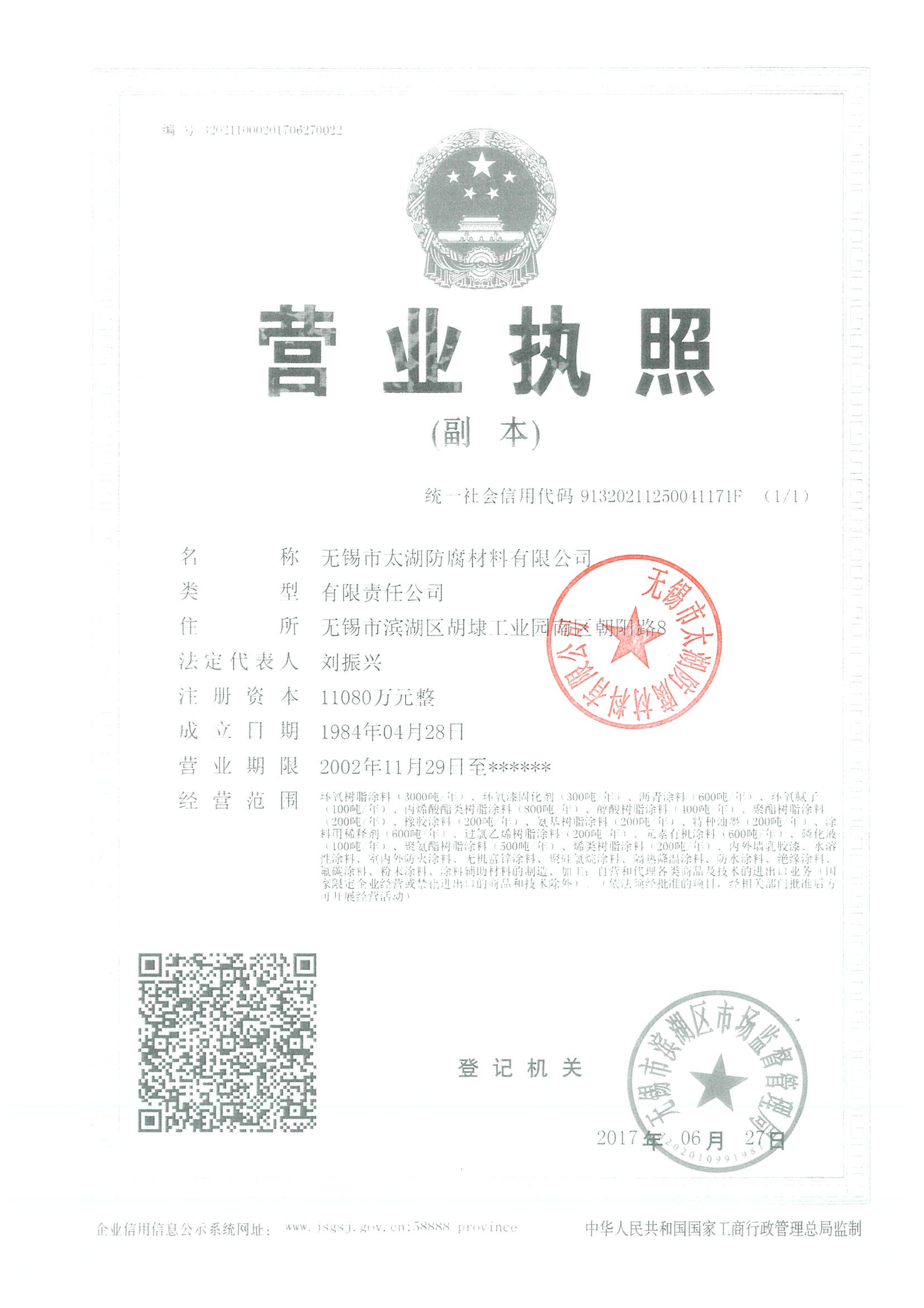 公司介绍 | 本公司原名为:无锡市太湖防腐材料厂,现更名为:无锡市太湖防腐材料有限公司,原税务登记证号:320206250041171 现税务登记证号为:91320211250041171F,根据集团公司文件要求,我公司重新申请二级网络成员资格。 |