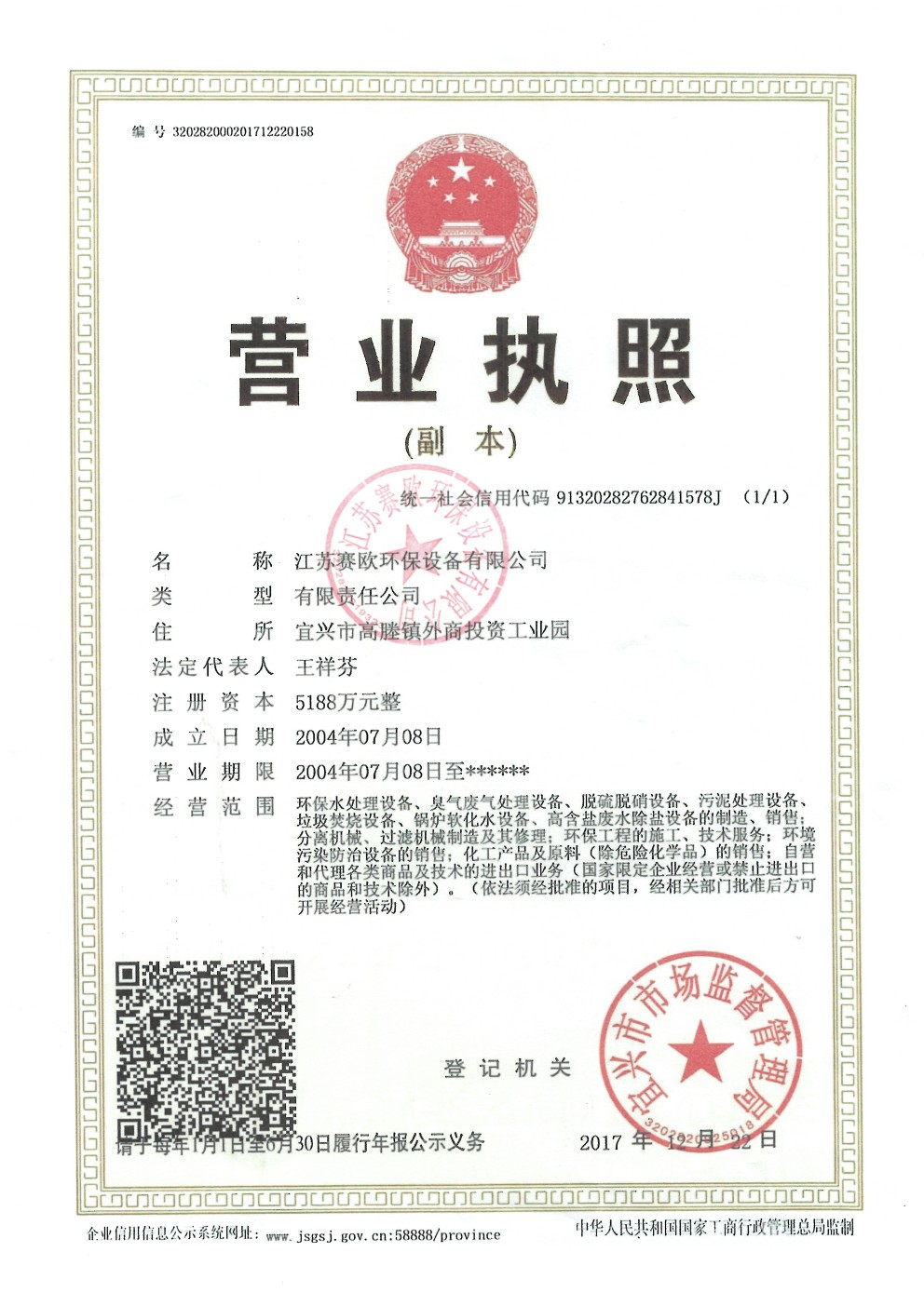 江苏赛欧环保设备有限公司坐落在国家级高新技术产业开发区-中国宜兴环保科技工业园,是一家集研究、设计、开发、承包、制造于一体的高新技术企业,专业从事水处理、环保工程设计、环保项目承包、环保设备制造等业务。
