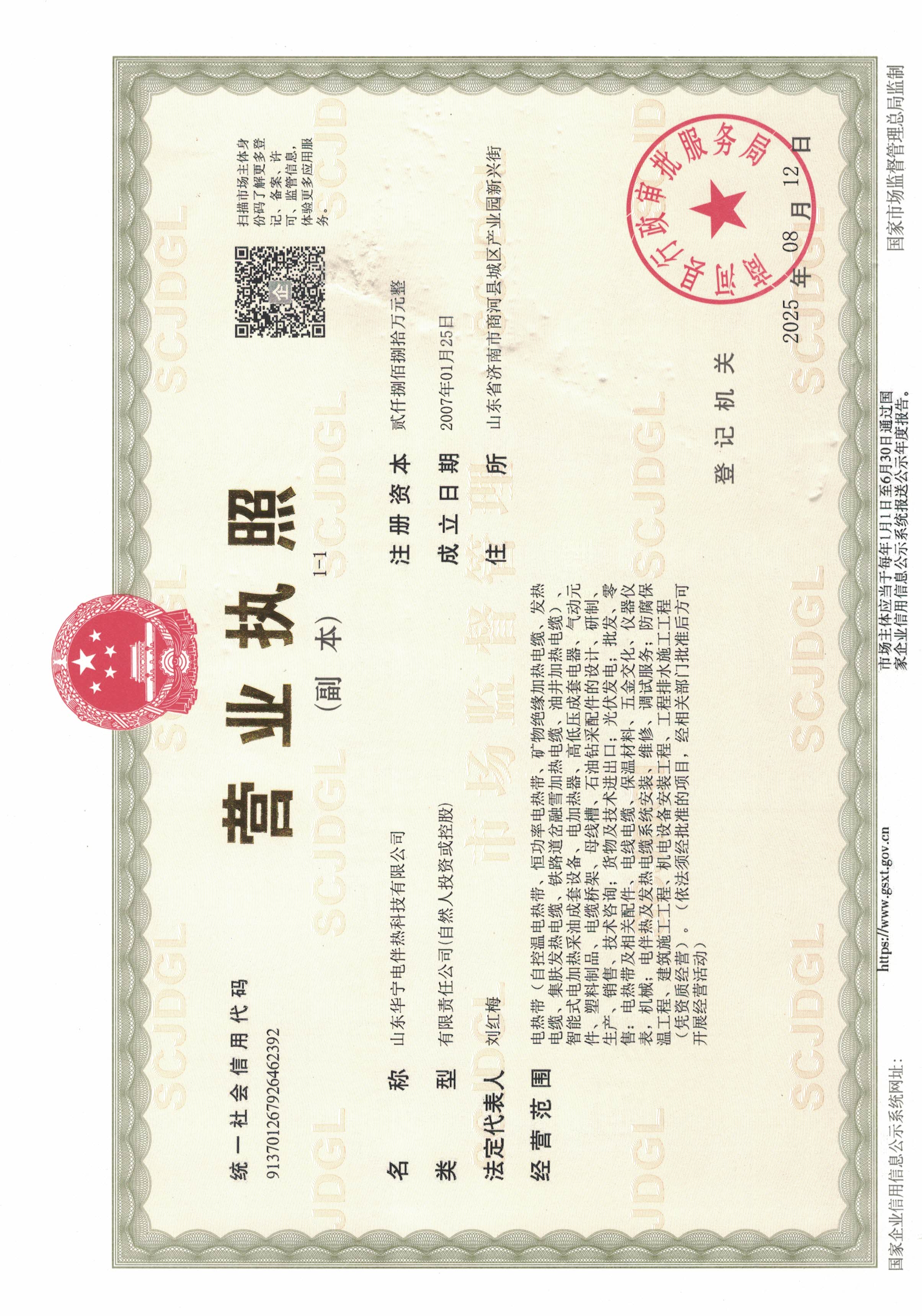 经营范围 | 电伴热及电加热产品 ,自控温电热带,恒功率电热带,矿物绝缘加热电缆,发热电缆,集肤电缆,融雪电缆,油井加热电缆,智能式电加热采油成套设备 | ||||
