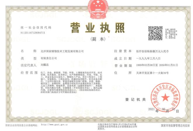 北洋国家精馏技术工程发展有限公司(Peiyang National Distillation Technology Corporation Limited)是在国家工商总局核准注册的高新技术企业,注册资本为5568万元,其中天津大学投资3068万元,天津泰达国际创业中心投资2500万元。主要从事化工分离技术的开发、化工塔器设备的设计制造及现场服务。公司利用国家计委拨付的世界银行480万美元科技贷款与配套资金2500万元,共计总投资6880万元用于基地和企业建设。公司由研究中心、中试基地和产业基地三部分组成。