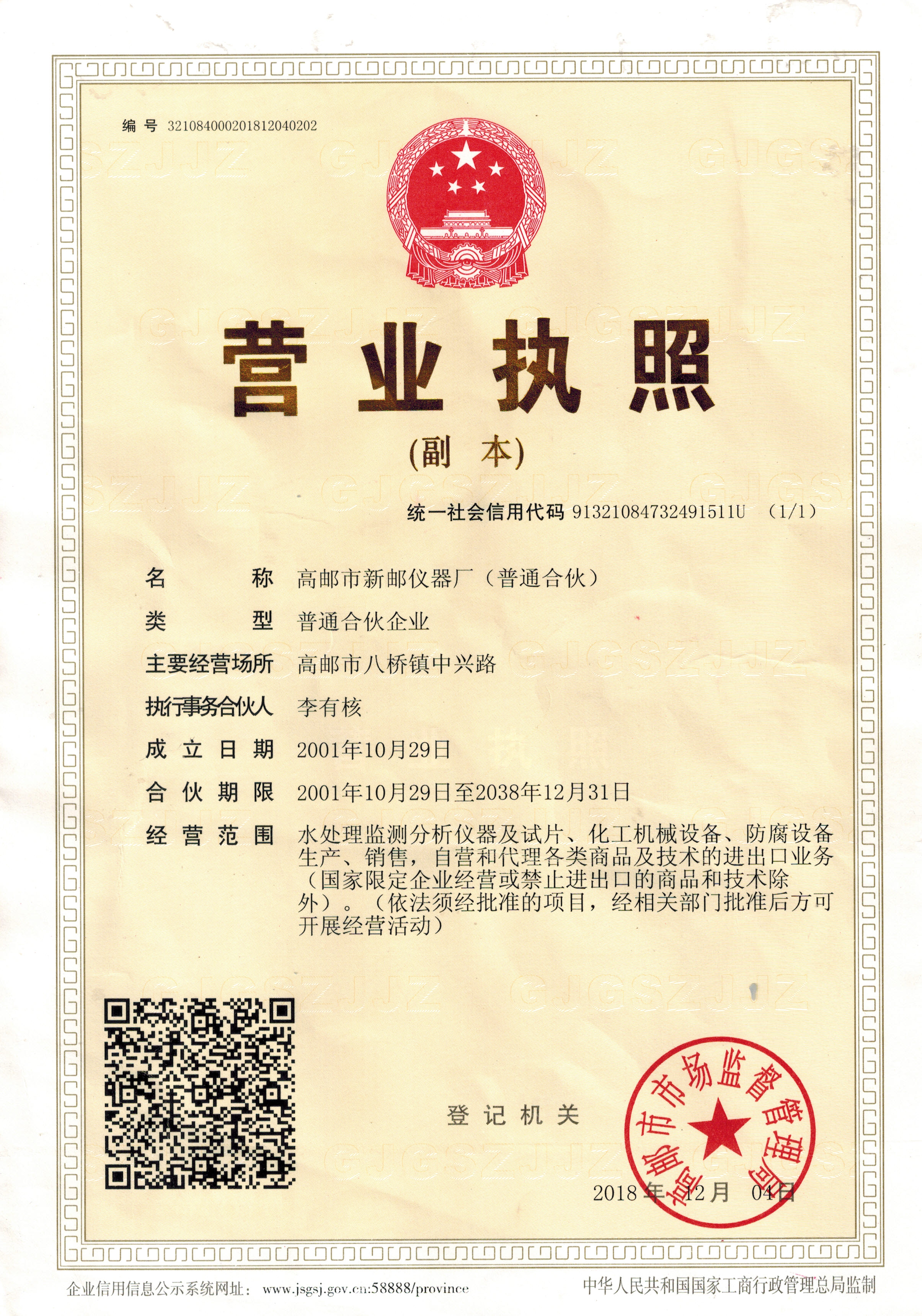 经营范围 | 水处理监测分析仪器及试片、化工机械设备、防腐设备生产、销售。 | ||||