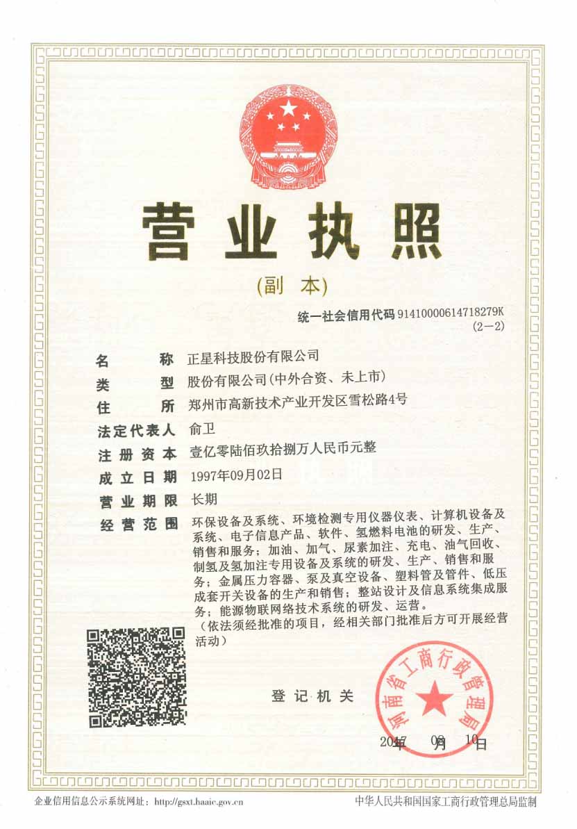 2000年正星公司通过ISO9001国际质量体系认证。2003年又通过了ISO9001(2000版)换版认证和ISO14000环境质量体系认证;2006年又通过了ISO9001(2000版)复评认证和ISO14000(2004版)环境质量体系换版认证;2009年又通过了ISO9001(2008版)复评认证和ISO14000(2004版)环境质量体系换版认证,2012年再次通过现场审核;2004年正星牌加油机被国家质检局授予“中国名牌”产品称号;2006年正星牌加油机被国家质检总局授予“产品质量国家免检”称号;2007年正星牌加油机被国家质检局复核后再次授予“中国名牌”产品称号;2011年,正星品牌获中国驰名商标。