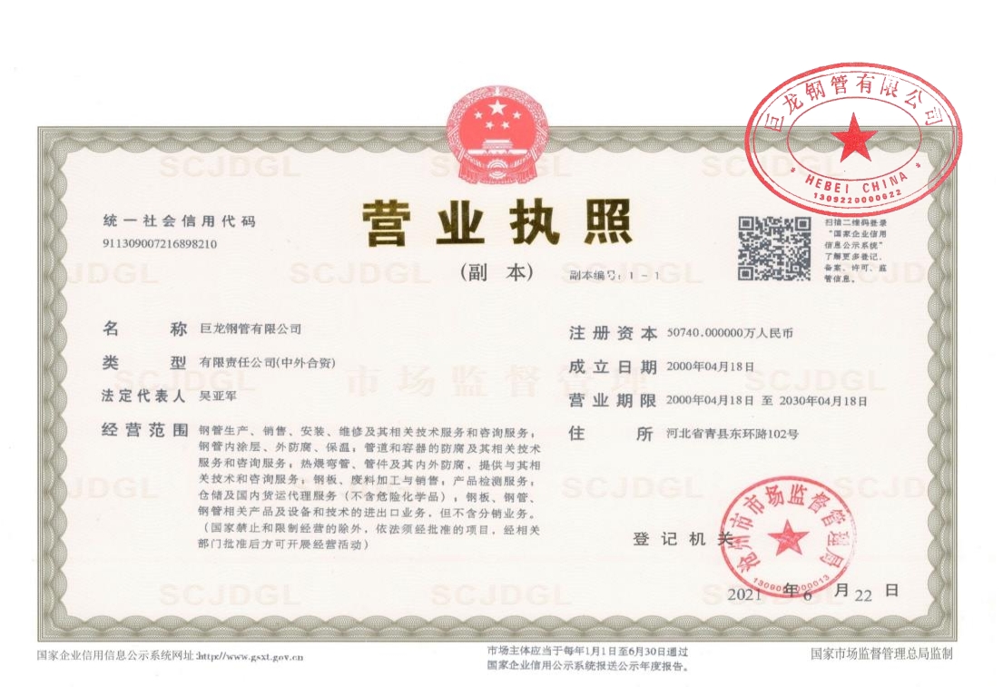巨龙钢管有限公司是由中国石油集团渤海石油装备制造有限公司和日本伊藤忠丸红铁钢株式会社投资建设的中外合资企业,是中国综合实力最强的专业从事石油天然气输送用高标准大口径直缝埋弧焊钢管研发、制造和防腐于一体的大型钢管制造企业。公司成立于2000年4月,位于河北省青县。拥有国际先进、国内领先的两条JCOE大口径直缝埋弧焊钢管生产线、两条钢管内外防腐生产线,具有丰富的生产经验和技术储备,能为用户提供大口径直缝埋弧焊管及防腐全系列的产品与服务。大口径直缝埋弧焊钢管年综合产能40万吨、钢管内外防腐年综合产能480万平方米。公司拥有系统高效的质量、安全管理体系,取得了美国石油学会API 5L、API 2B认证、ISO9001质量体系认证、HSE/OHS/EMS三合一体系认证、压力管道特种设备制造许可证及国外大型石油公司的市场准入资质认证。公司凭借雄厚的技术研发实力,积极引领中国管线钢管的开发、生产及应用,携手宝钢、鞍钢、武钢、南钢、沙钢、首钢、舞钢、湘钢等国内大型钢铁企业,率先开发出了X60、X65、X70、X80、X100、X120钢管和海底管线用钢管、抗大变形钢管、抗酸钢管、低温钢管等系列产品,填补了国内空白。公司是中国石油、中国海洋石油、中国石化等国家重点油气管道工程及地方油气管网建设的主要供货企业,产品远销到销俄罗斯、美国、意大利、澳大利亚、哈萨克斯坦、土库曼斯坦、乌兹别克斯坦、伊拉克等国家,已累计生产高标准油气输送用大口径直缝埋弧焊钢管260多万吨(6000多公里)。公司始终坚持“追求价值、诚信回报”的核心价值观,秉承“科学、高效、精细、落实”的管理理念,以一流的产品、一流的服务、一流的信誉真诚回报用户。