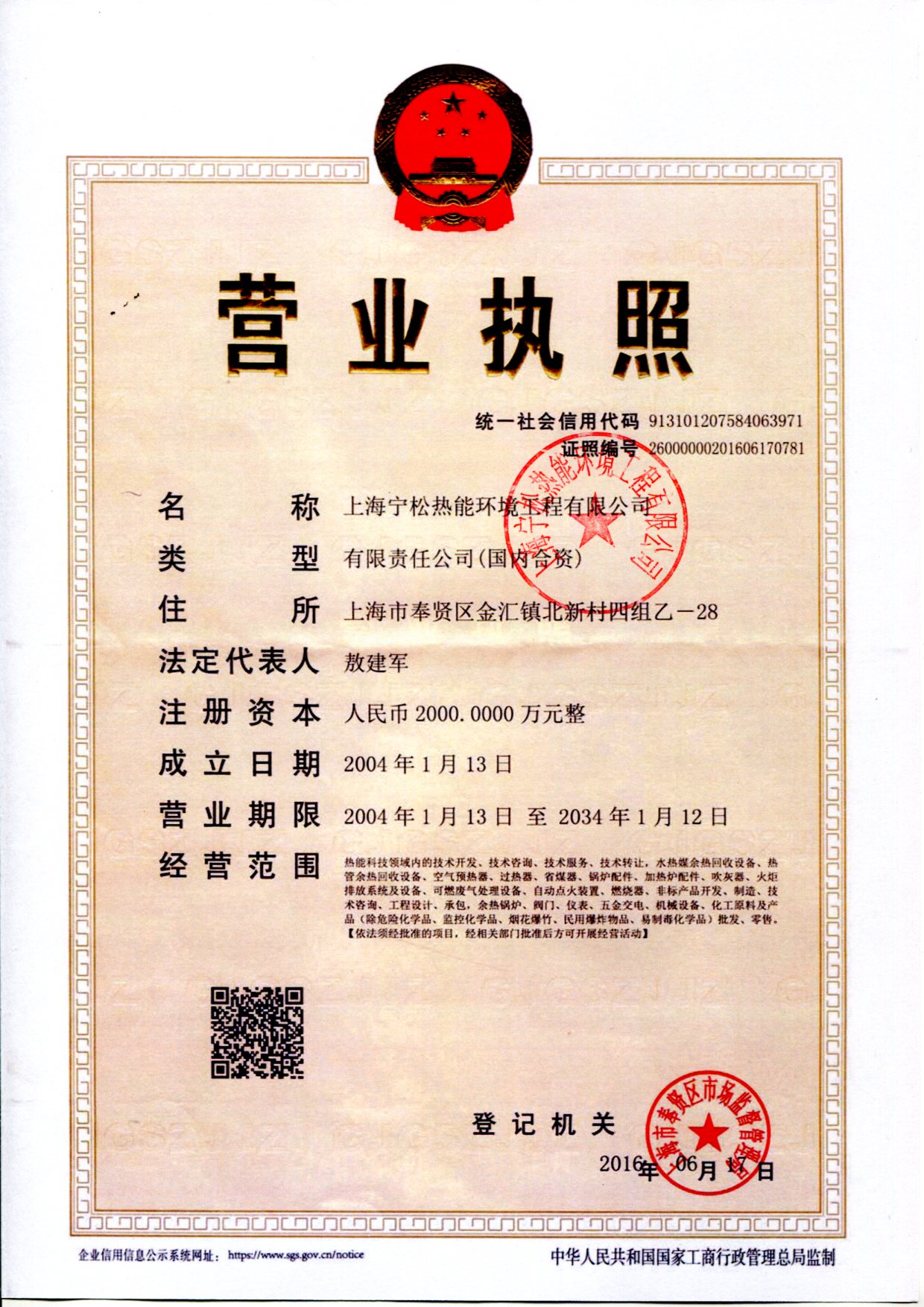 上海宁松热能环境工程有限公司是中国石油化工集团公司物资资源市场一级成员单位,中国石油天然气集团公司物资供应商准入成员。并通过ISO9001:2000质量体系认证。“140万吨/年重油催化装置CO废热锅炉防腐节能改造技术”获中国石化科技进步三等奖。公司拥有的产品和技术达到国内领先的水平,并拥有“具有脱硝功能的抽屉模块式余热锅炉”“加热炉对流段余热锅炉受热面的模块式结构”“用于大型连续重整装置四合一或二合一加热炉的余热锅炉”“组合式水热媒空预器”、“模块式翅片管换热器”、“燃气激波吹灰系统”“一种低氮氧化物瓦斯燃烧器”等多项催化余热锅炉和加热炉专利技术。