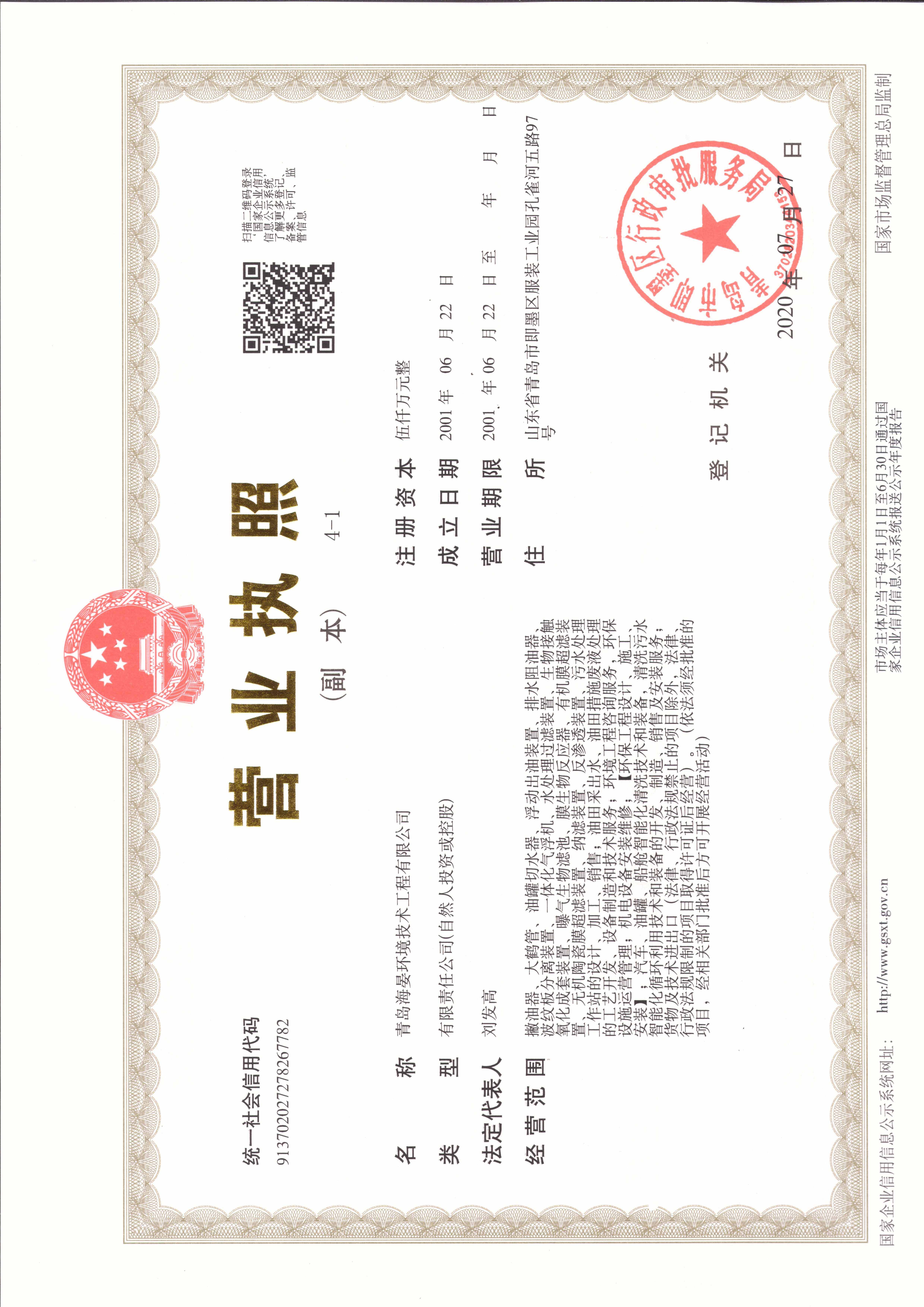 经营范围 | 撇油器、大鹤管、油罐切水器、浮动出油装置、排水阻油器、波纹板分离装置、一体化气浮机、水处理过滤装置、生物接触氧化成套装置、曝气生物滤池、膜生物反应器、有机膜超滤装置、无极陶瓷膜超滤装置、纳滤装置、反渗透装置、污水处理工作站的设计、加工、销售;环境工程咨询服务,环保设施运营管理;机电设备安装维修;货物及技术进出口。 | ||||