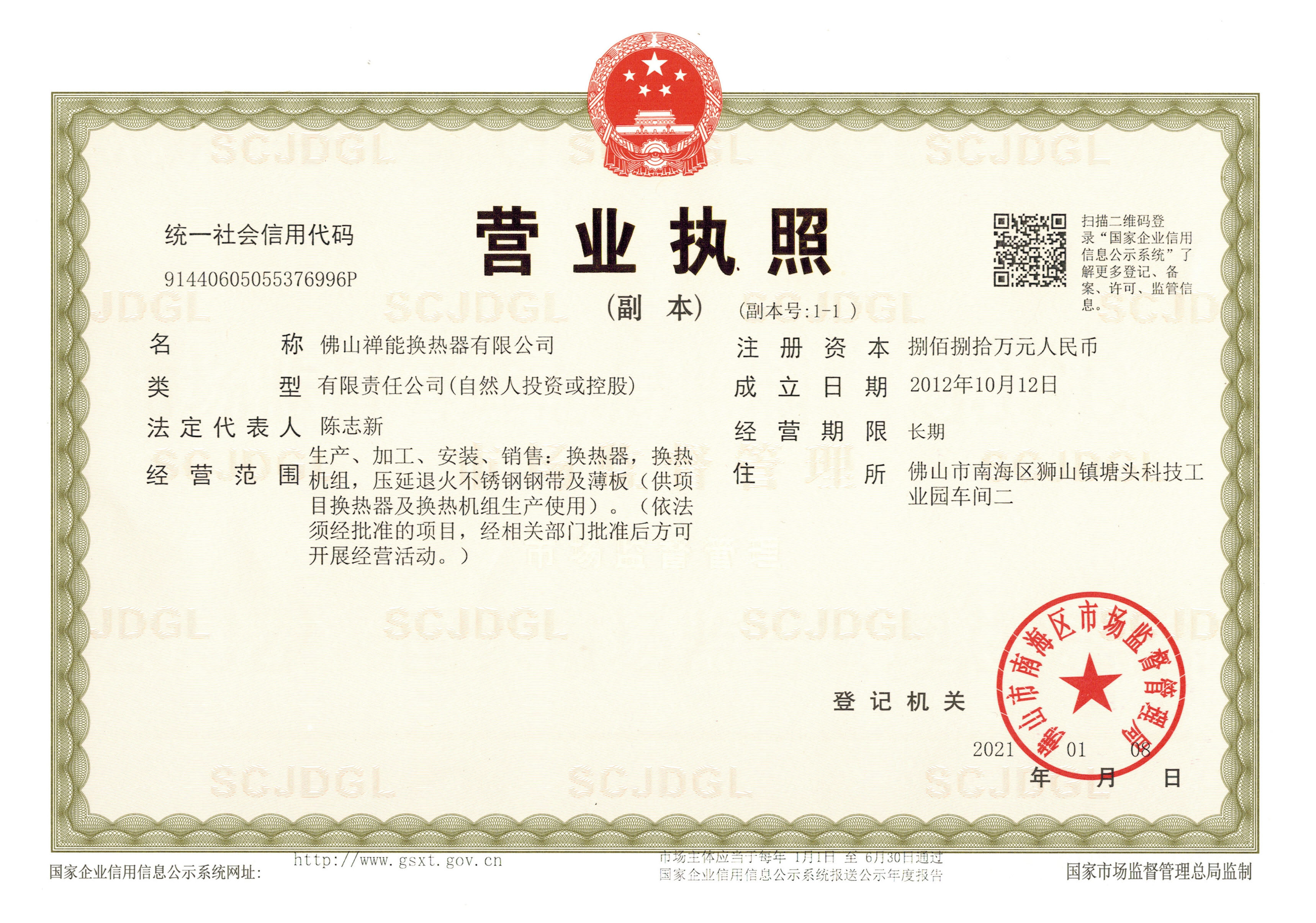 佛山禅能换热器有限公司(原佛山市澜石传热设备厂)创建于1993年,是专业从事热交换器研发、制造、销售及服务的换热解决方案提供商,公司通过ISO9001: 2015质量体系认证。