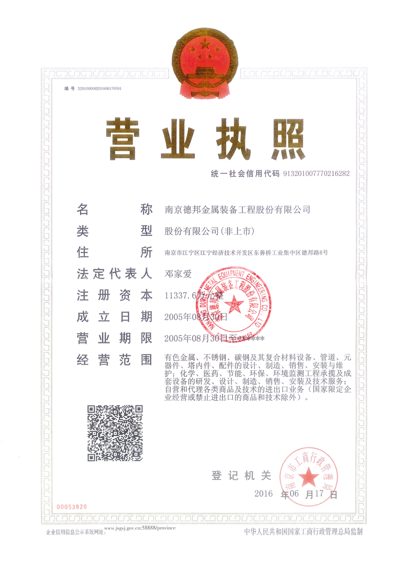 南京德邦金属装备工程股份有限公司是注册于国家级开发区——江宁经济技术开发区内的股份制公司。公司为国家级高新技术企业,具有三类高压容器(A1)制造资质,三类高压容器(A1)设计资质,ASME U钢印资质,化工石化医药行业专业乙级、市政行业专业丙级设计总承包资格,A、B级压力管道制造资质,金属波纹管膨胀节“A”级制造资格,通过了压力容器用爆炸复合钢板“A、B”类产品安全注册,通过了ISO9001质量体系和OHSAS18001:2007职业健康安全管理体系认证。 公司建有基础能化装备、战略能化装备、工艺技术及单元装置总包、管道管件和复合板及非标有色金属制品、国际市场和外资公司五大市场服务平台。主要从事钛及钛合金、镍及镍合金、铜及铜合金、锆、钽、铝、不锈钢、双相不锈钢及其复合材料储存、反应、热交换和分离容器、管道管件和制品的研发、设计、制造和安装;金属复合材料加工与销售;卤水制盐、精镏分离及碱液浓液提纯等工程设计、承揽、技术服务和项目管理;代理各类商品和技术的进出口业务。产品主要运用于炼油、石化、化工、环境工程、海洋工程、冶金、医药、农药、核电等行业。 公司下设特材装备工厂、重容装备工厂、换热器工厂、管道管件工厂和金属爆炸复合材料工厂。总占地面积十二万平方米,总建筑面积七万五千平方米,现有员工近千余名,其中中级职称以上人员近百人,专业技术人员所占比例达42%。建有江苏省省级企业技术中心、省级工程技术研发中心、企业院士工作站,与多所知名院校和科研院所共同设立材料分析实验、焊接热处理、高效传质与分离和腐蚀与防护等实验室。拥有专利近百项。 公司依据产品为各工厂配备专业数控、自动化设备,主要有:等离子自动焊机、管与管板自动焊机和超高压数控液压胀机十多台;数控120毫米厚板和40毫米有色金属专用等系列卷板机8台;5米、3.5米系列高速数控钻床、4*12米数控等离子切割机、150毫米、60毫米系列超高压数控水刀万能切割机;8000吨、1600吨等系列油压机;150吨、50吨、32吨等天车近50台;微机控制电液伺服万能试验机、冲击试验机、台式直读式光谱仪等等。 德邦人心怀“办特色企业,创知名品牌”之理想;坚持“崇德、致远、兴邦”之企业精神;树立“以质量为先,诚信为本,使顾客满意;以科技创新、持续改进,求公司发展”的质量方针;以 “客户的需求是我们的追求”的经营理念,努力打造国际知名品牌。
