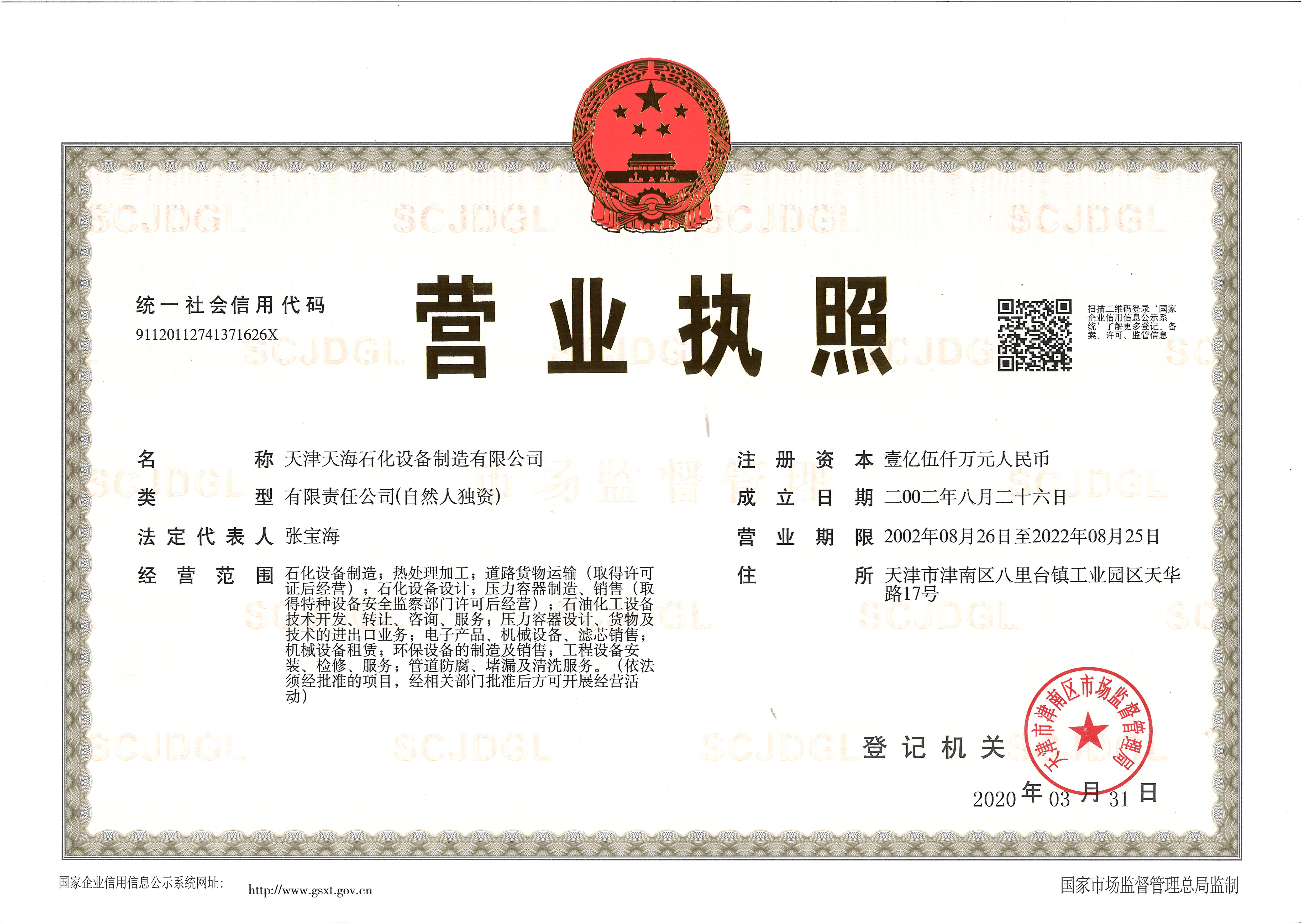 注册地址 | 天津市津南区 | 法定代表人 | 张宝海 | 注册资本 | 15000万人民币 |