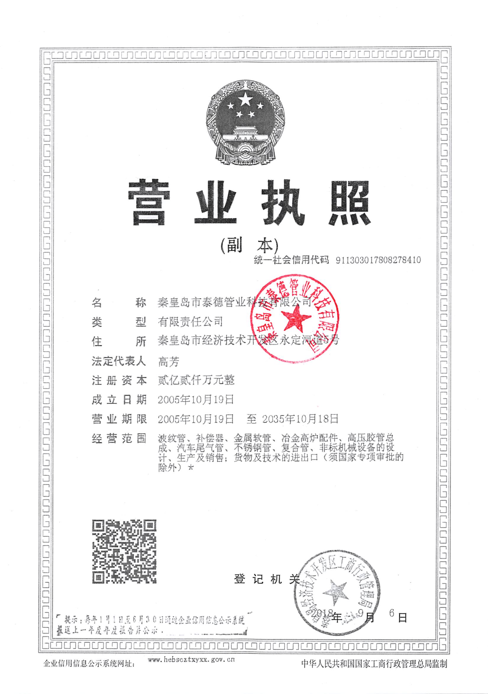 经营范围 | 波纹管、补偿器、金属软管、冶金高炉配件、高压胶管总成、汽车尾气管、不锈钢管、复合管、非标机械设备的设计生产及销售;货物及技术的进出口(须国家专项审批的除外) | ||||