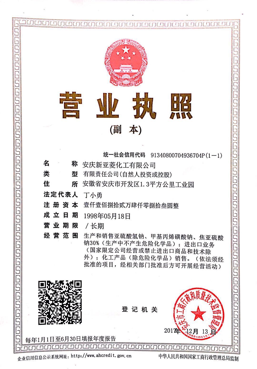 经营范围 | 生产和销售亚硫酸氢钠。进出口业务。化工产品销售。 | ||||