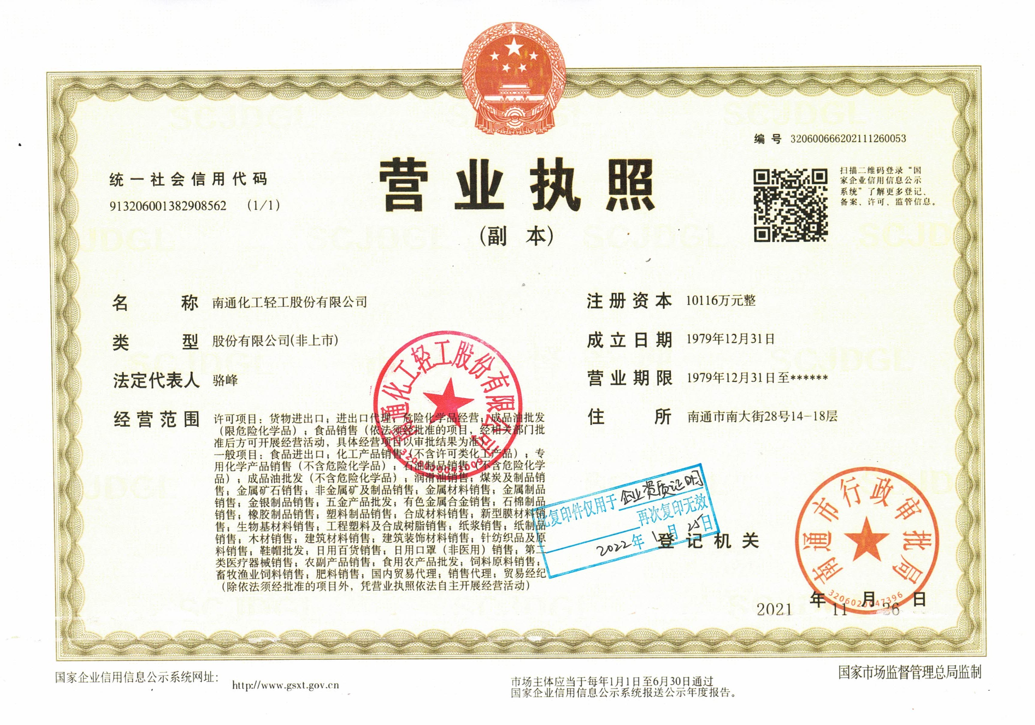 南通化工轻工股份有限公司成立于1963年7月1日,1997年7月25日经江苏省人民政府批复,整体改制为股份有限公司,股份结构全部为自然人股。公司注册资本10116万元。