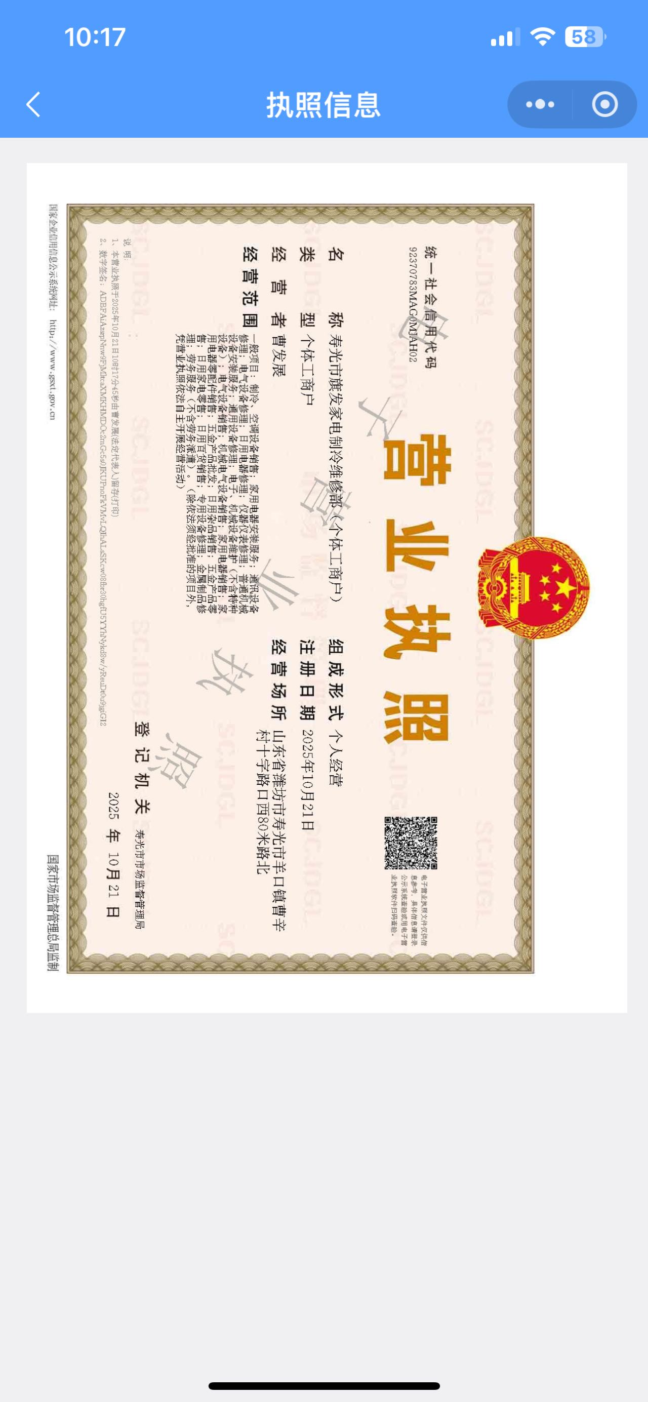| 经营范围 | 家电维修、制冷 | ||||
