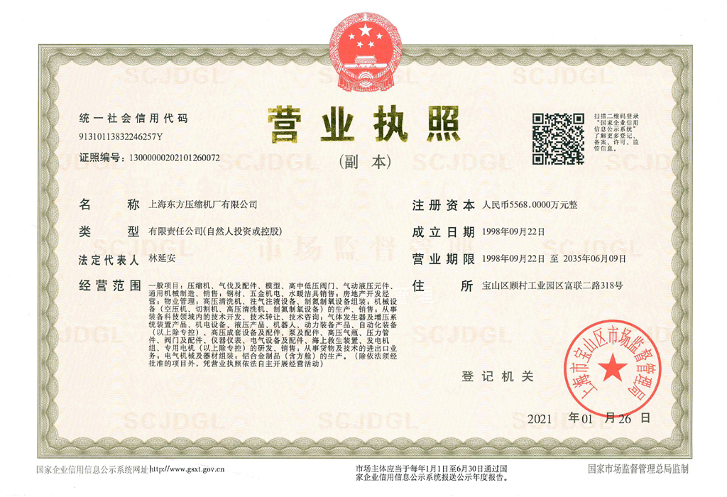 | 经营范围 | 压缩机、气伐及配件、模型、高中低压阀门、气动液压元件、通用机械制造、销售;钢材、五金机电、水暖洁具销售;房地产开发经营;物业管理;高压清洗机、注气注液设备、制氮制氧设备组装;机械设备(空压机、切割机、高压清洗机、制氮制氧设备)的生产、销售;从事装备科技领域内的技术开发、技术转让、技术咨询;气体发生器及增压系统装置产品、机电设备、液压产品、机器人、动力装备产品、自动化装备(以上除专控)、高压成套设备及配件、泵及配件、高压气瓶、压力管件、阀门及配件、仪器仪表、电气设备及配件、海上救生装置、发电机组、专用电机(以上除专控)的研发、销售;从事货物及技术的进出口业务;电气机械及器材组装;铝合金制品(含方舱)的生产。【除依法须经批准的项目外,凭营业执照依法自主开展经营活动】 | ||||