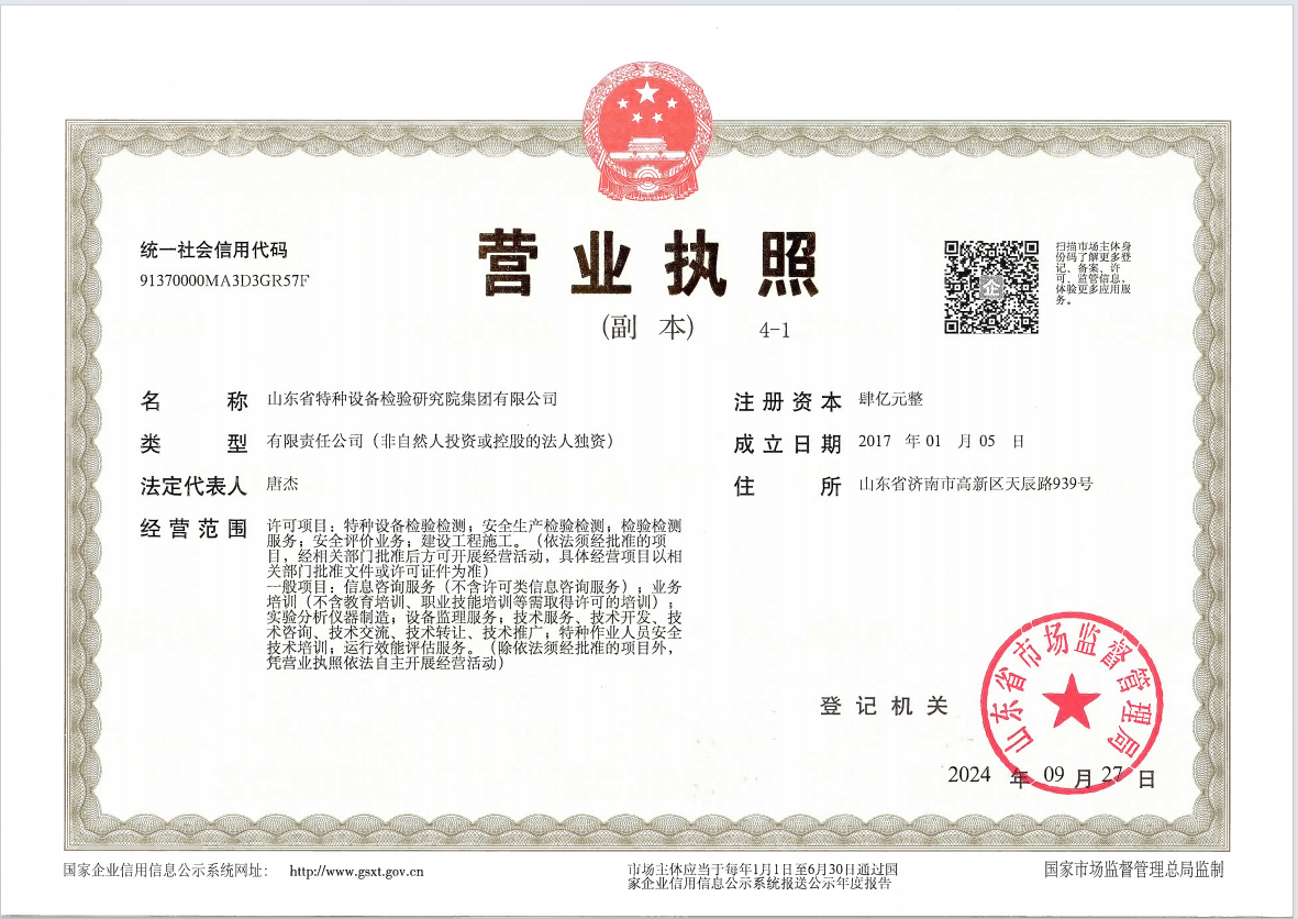 山东省特种设备检验研究院集团有限公司创始于 1978年,作为特种设备安全领域的专业科研与技术服务机构,我们致力于为社会和客户提供特种设备安全保障解决方案,以客观公正、科学准确的服务成果,在客户与监管机构和社会公众间传递安全信任。不断探索安全管理科学,加强应用技术创新,以先进可靠、优质高效的服务协助客户应对质量、环境、健康、安全和社会责任等发展挑战。作为值得信赖的伙伴,我们提供的创新性解决方案,不仅能够帮助客户落实安全主体责任、符合法规标准要求,更能够协助客户降低风险、提升业绩,促进可持续发展。