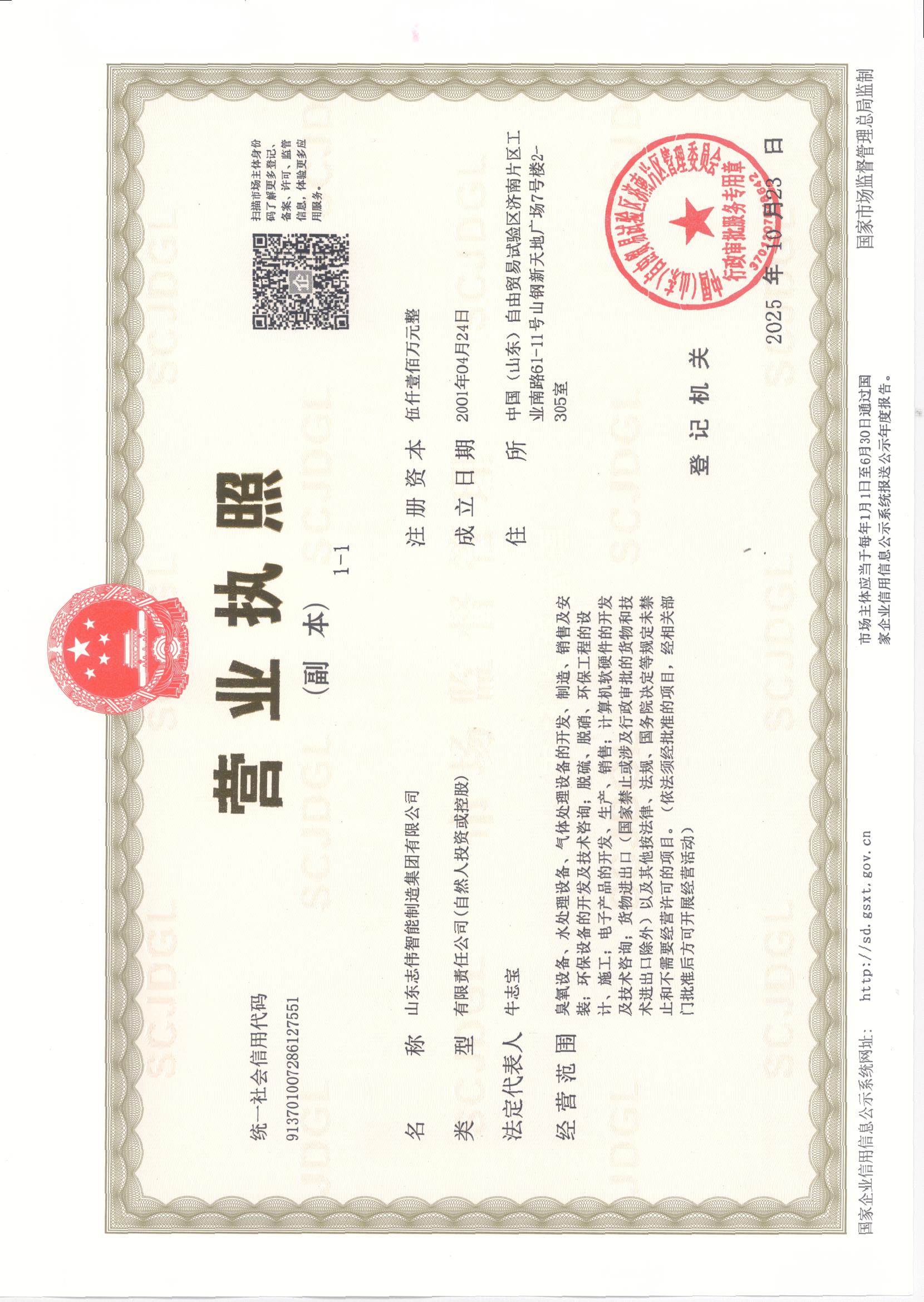 山东志伟智能制造集团有限公司成立于2001年,生产经营能力方面,公司总部位于济南高新技术开发区山钢新天地广场7号楼2单元3层占地1000平方米;生产基地位于齐河经济开发区新旧动能转换先行区占地54000平方米。生产经营能力方面,公司是山东省国资委投资参股的的高新技术企业;从事臭氧应用技术和臭氧设备制造及深度处理工艺包系统,为用户提供臭氧系统工程设计、设备安装、调试、维护等专业服务。公司现有人员85人,其中技术研发人员10人,销售团队18人,生产及售后服务46人,管理及财务人员8人。公司现年产3000KG臭氧系统,24000m3制氧系统,市场占有率稳居国内前三,服务于石油、化工、冶炼、电力、自来水厂、污水处理厂等行业。