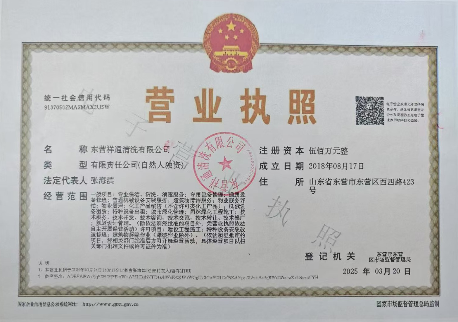 东营祥通清洗有限公司成立于1998年,是集清洗技术研究、清洗施工、物业清洗、日常清洗、各种清洗剂材料生产、物业管理保洁于一体的高技术清洗公司,目前拥有国际上最先进的进口美国超高压水射流成套清洗装置2台,国产成套清洗设备3台,装备精良;有一支动静设备拆装、清洗施工经验丰富,解决疑难垢质堵塞的专业化设备清洗队伍,能根据垢物、垢质情况,利用高压水射流装置造反30-150MP高压水射流,对石油化工等工业领域、海洋、市政工程,进行高效、环保和不同用途的高质量清洗。