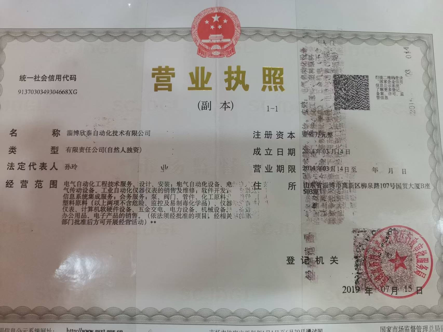 注册地址 | 山东 淄博市 高新技术产业开发区 | 法定代表人 | 孙玲 | 注册资本 | 100万人民币 |