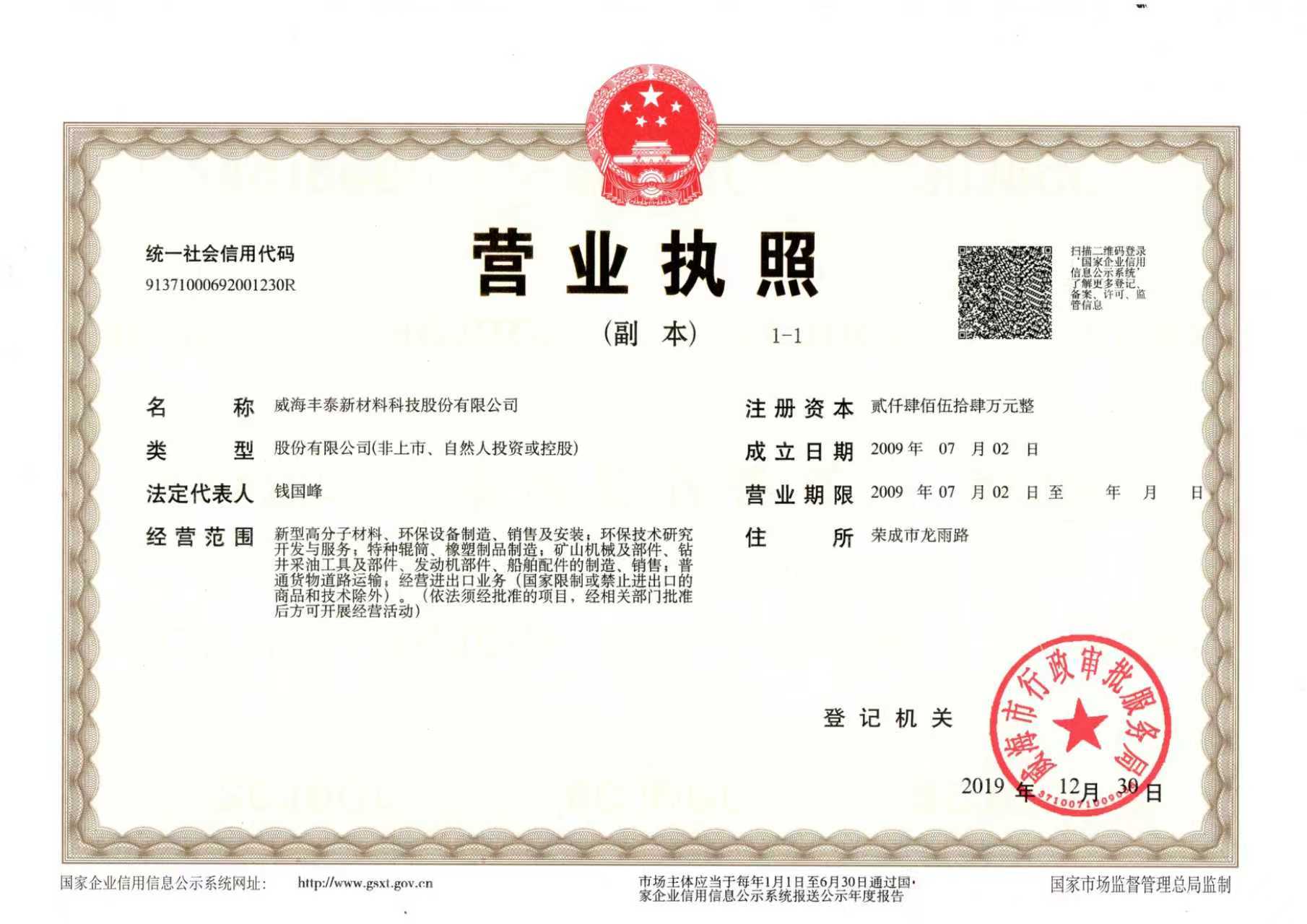 威海丰泰新材料科技股份有限公司创立于2009年7月,坐落在荣成市石岛工业园龙雨路468号。厂区占地面积2.1万平方米,注册资本2454万元。现有职工78人,有大型数控机床等先进生产设备30多台套,有独立的技术研发机构“丰泰环保专用设备”研发中心,有各类技术人员18名,有独立的实验室,配备了具有现代化的检测设备仪器20多台。