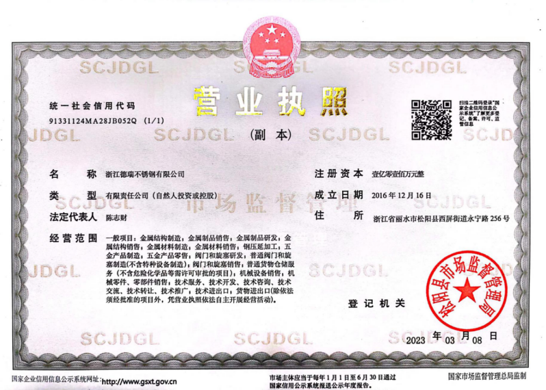 浙江德瑞不锈钢有限公司位于浙江省丽水市松阳县西屏街道永宁路256号,于2016年12月16日在丽水市松阳县市场监督管理局注册成立,注册资金壹亿零壹百万元,是集不锈钢管道系统研发、生产、销售、售后于一体的创新型企业。 公司于2023年被认定为国家高新技术企业。公司自创立以来大力引进各类人才,采购各种设计、制作、生产、检验设备,拥有属于自己的优秀人才队伍、先进的生产设备、完善的配套设施、封闭式的生产管理和广阔的销售渠道,为公司的持续发展提供了有力保障。