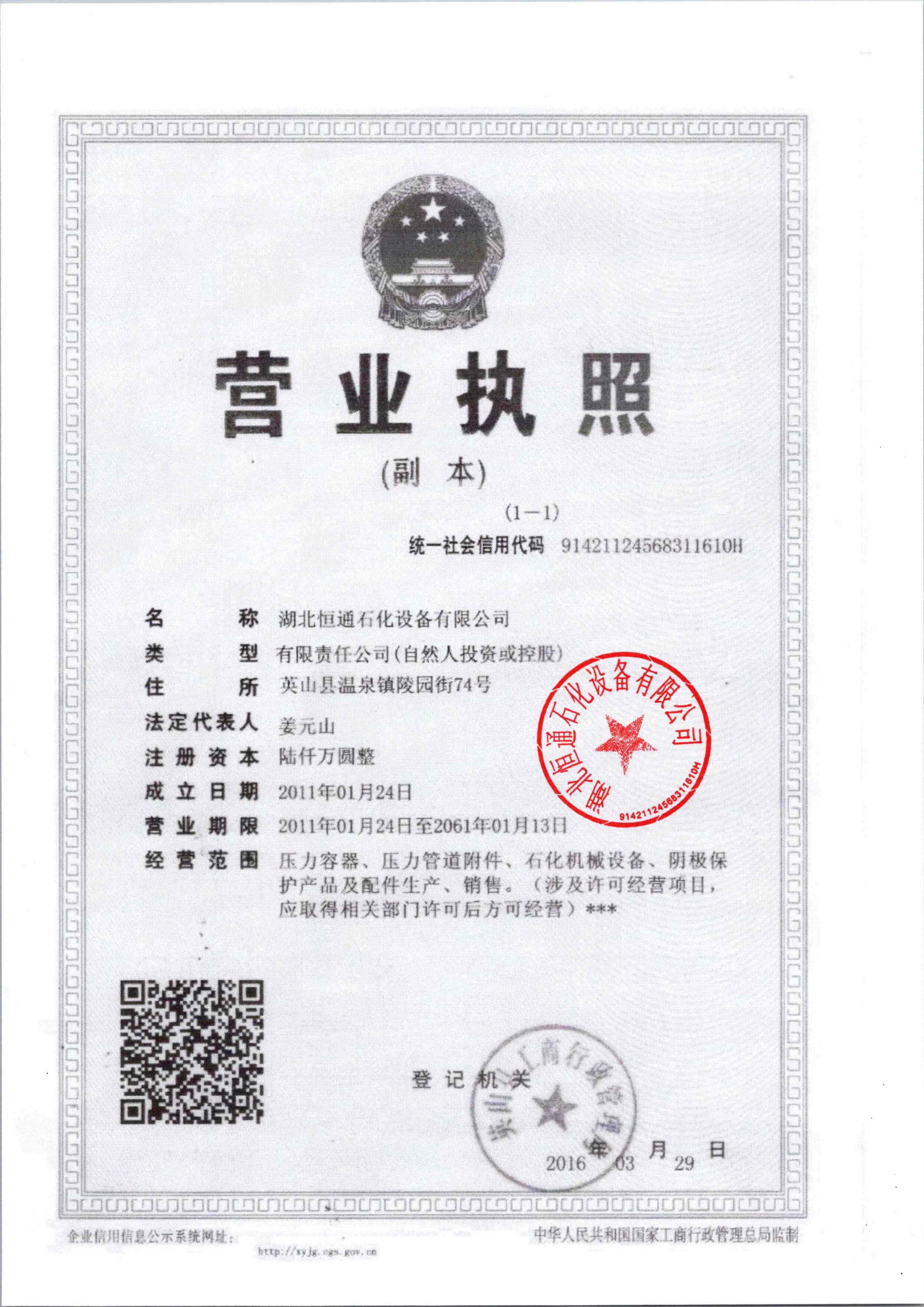 湖北恒通石化设备有限公司(原名英山县恒通管道附件厂)是一九六九年建厂的国有“湖北省英山县阀门厂”改制后成立的压力容器、压力管道附件、石化机械设备、阴极保护产品及配件生产、销售的企业。企业注册资金6000万元,原中国通用机械阀门行业协会会员。企业新厂区总占地面积30000m2,总投资10700万元,一期投资7800万元,建成新厂区生产车间面积12000m2(其中压力容器车间面积8000m2,压力管道加工车间面积4000m2),环保等已达标验收,于2019年12月投产。无损检测、计量、理化试验、强度、致密性及其它检验手段完善并配备符合标准要求。主要生产、检测设备166台套,计量器具160件,初中级技术人员18人,现有职工82人。主导产品有“双卡”牌绝缘接头、绝缘法兰、清管器收(发)球筒装置、快开盲板、过滤器分离器、压力容器等七大系列产品。产品主要适用于石油、天然气、冶金化工、环保、医药、给排水和发电等行业。