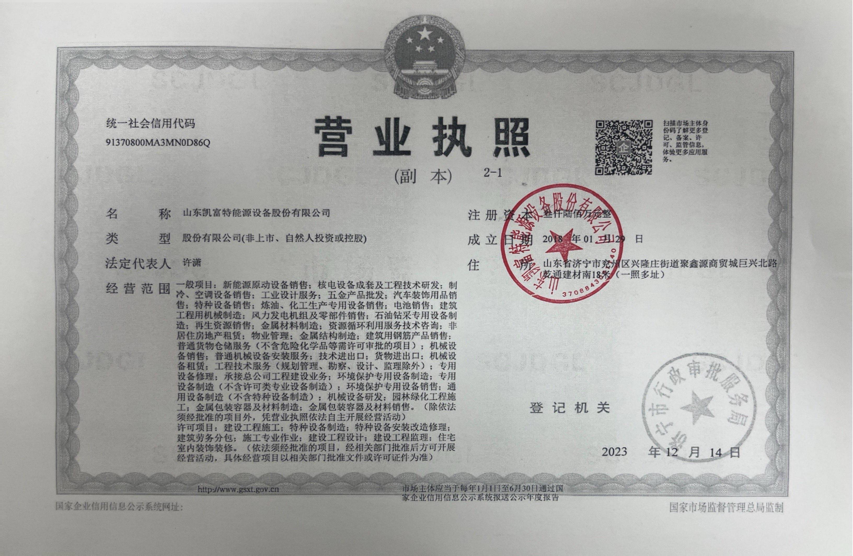 山东凯富特能源设备股份有限公司成立于2018年,坐落于“孔孟之乡、运河之都”---山东济宁,是齐鲁股权交易中心挂牌上市企业。目前主要从事阻隔防爆撬装加油装置、低温液体储罐 、各种储罐、压力容器、化工设备罐、片装罐、立式罐、日用油箱、钢结构、网架等产品的设计、研发、生产与安装,以及承接加油(气)站、加氢站整体建设工程、石油化工工程、钢结构工程、立式储罐制作安装工程、水泥罐制作安装工程等各类施工安装工程。公司现拥有石油化工工程施工总承包、建筑工程施工总承包、钢结构工程专业承包、施工劳务等资质,同时具备特种设备生产许可证(压力容器、低温液体储罐、压力管道安装)、全国工业产品生产许可证、防爆合格证等,还拥有13项实用新型专利证书、2项发明型专利,也是齐鲁股权交易中心挂牌上市企业。
