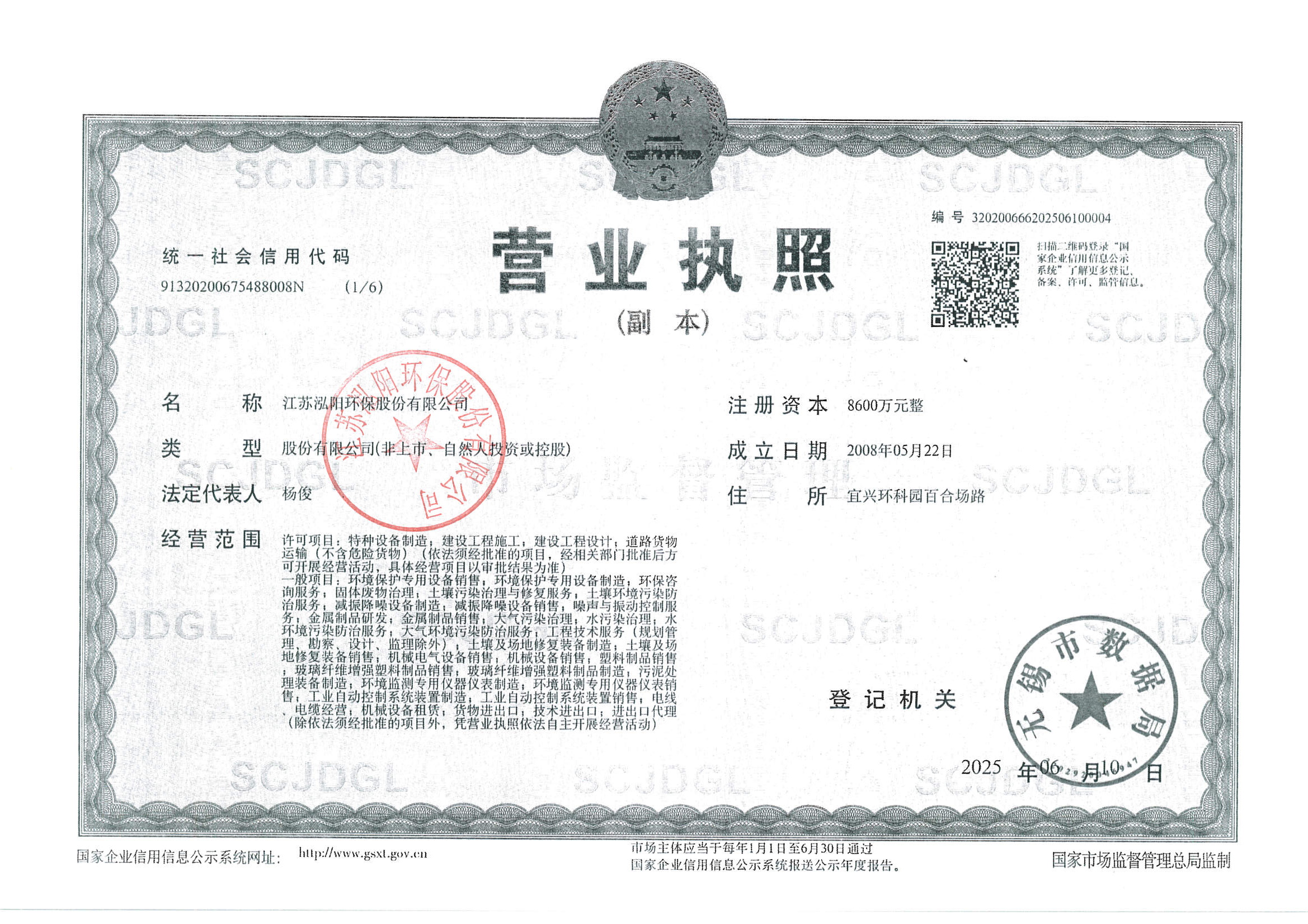 | 经营范围 | 许可项目:特种设备制造;建设工程施工;建设工程设计;道路货物运输(不含危险货物)(依法须经批准的项目,经相关部门批准后方可开展经营活动,具体经营项目以审批结果为准) 一般项目:环境保护专用设备销售;环境保护专用设备制造;环保咨询服务;固体废物治理;土壤污染治理与修复服务;土壤环境污染防治服务;减振降噪设备制造;减振降噪设备销售;噪声与振动控制服务;金属制品研发;金属制品销售;大气污染治理;水污染治理;水环境污染防治服务;大气环境污染防治服务;工程技术服务(规划管理、勘察、设计、监理除外);土壤及场地修复装备制造;土壤及场地修复装备销售;机械电气设备销售;机械设备销售;塑料制品销售;玻璃纤维增强塑料制品销售;玻璃纤维增强塑料制品制造;污泥处理装备制造;环境监测专用仪器仪表制造;环境监测专用仪器仪表销售;工业自动控制系统装置制造;工业自动控制系统装置销售:电线电缆经营;机械设备租赁;货物进出口;技术进出口;进出口代理(除依法须经批准的项目外,凭营业执照依法自主开展经营活动) | ||||