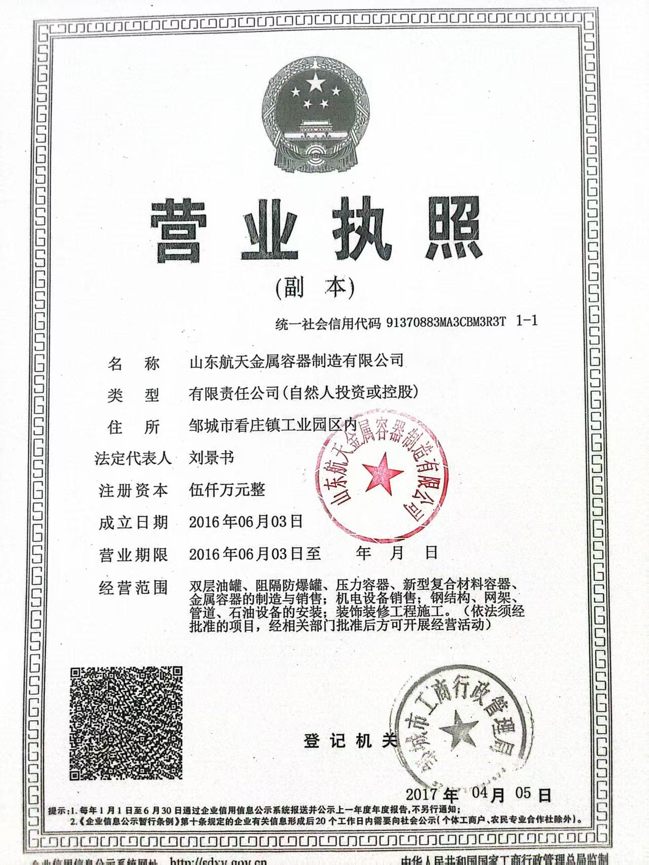 | 经营范围 | 双层油罐、阻隔防爆罐、压力容器、新型复合材料容器金属容器的制造与销售;机电设备销售;钢结构、网架、管道、石油设备的安装;装饰装修工程施工。(依法须经批准的项目,经相关部门批准后方可开展经营活动) | ||||