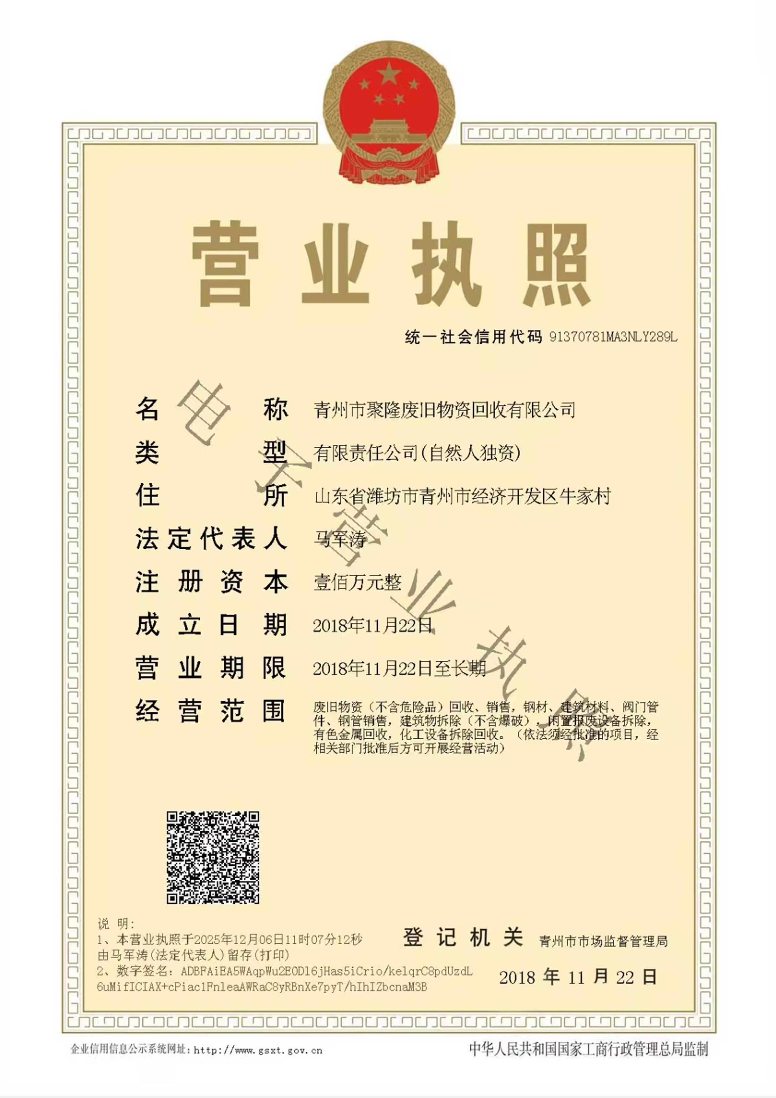 | 经营范围 | 废旧物资(不含危险品)回收、销售,钢材、建筑材料、阀门管件、钢管销售,建筑物拆除(不含爆破),闲置报废设备拆除,有色金属回收,化工设备拆除回收。 | ||||