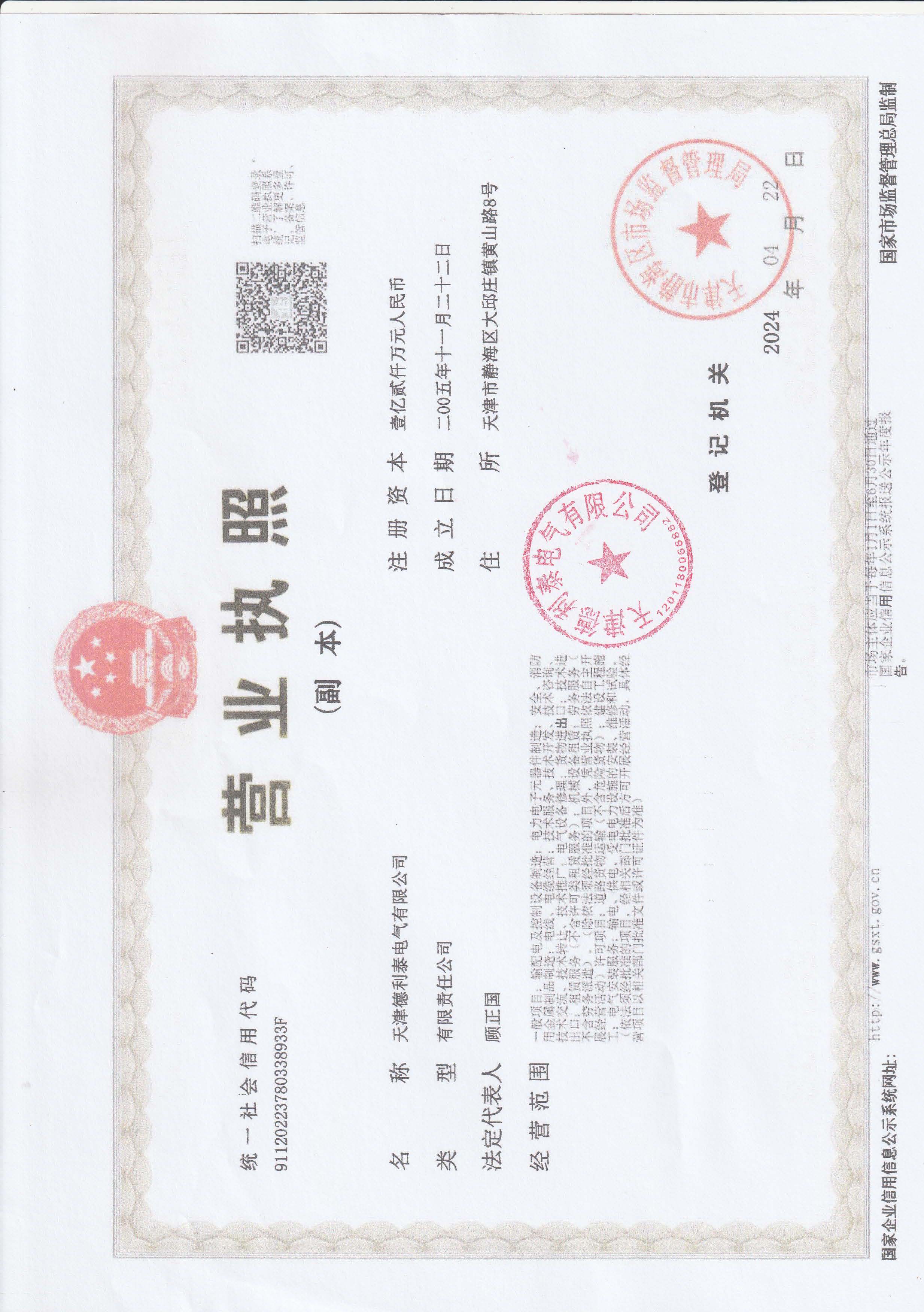本公司是国家级高新技术企业、中国电器工业协会理事单位、中国电器工业协会高压开关分会理事单位 、中国电器工业协会电控配电设备分会副理事长单位、天津市电力行业协会常务理事单位、天津市输配电设备制造行业协会副会长单位。“德利泰”商标被认定为“天津市著名商标”,其产品被评为“天津市名牌产品”。公司先后被国家经贸委等十部委及市政府授予 “重合同、守信用”单位。公司于1997年通过挪威船级社ISO9001质量体系认证,2003通过年低压成套配电设备CCC认证,2010通过职业健康安全管理体系认证和环境管理体系认证。并获得国家电网入网资格,与ABB、施耐德、西门子成为紧密合作伙伴。