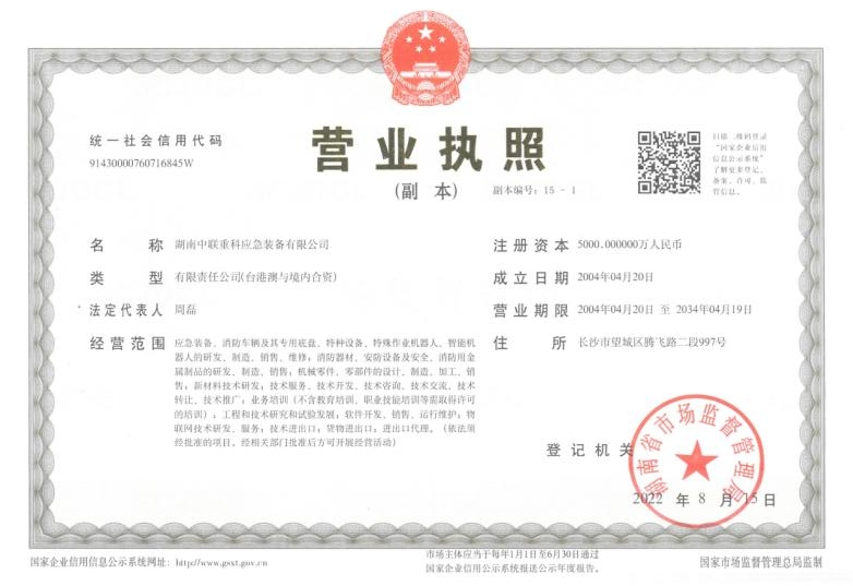湖南中联重科应急装备有限公司(简称中联应急), 应急装备、消防车辆及其专用底盘、特种设备、特殊作业机器人、智能机器人的研发、制造、销售、维修;消防器材、安防设备及安全、消防用金属制品的研发、制造、销售;机械零件、零部件的设计、制造、加工、销售;新材料技术研发;技术服务、技术开发、技术咨询、技术交流、技术转让、技术推广;业务培训的一家大型国有企业