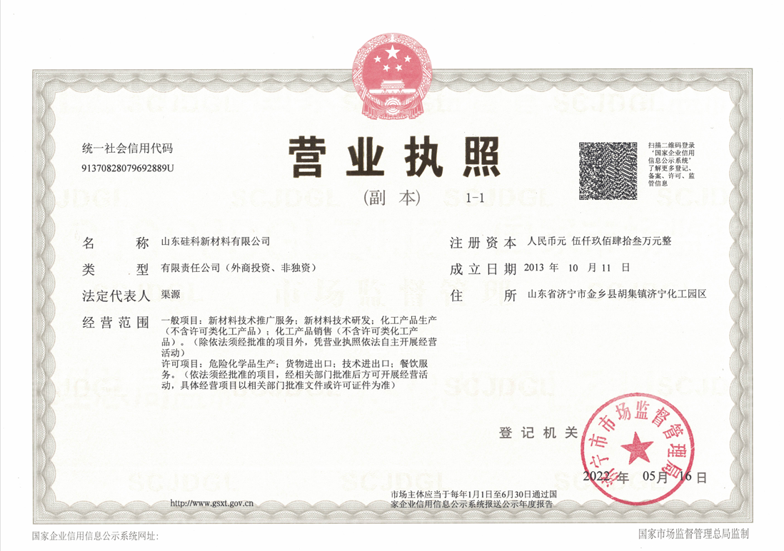 山东硅科新材料有限公司成立于2013年10月,座落于山东省济宁新材料产业园区,占地260亩,主要从事功能性硅烷及聚硅氧烷系列产品的研发,生产和销售。广泛应用于电子材料,交通运输,装配式建筑,绝缘材料,高性能复合材料等行业。公司是国家级专精特新“小巨人”企业、国家级绿色工厂、国家级博士后科研工作站、海关AEO高级认证企业。