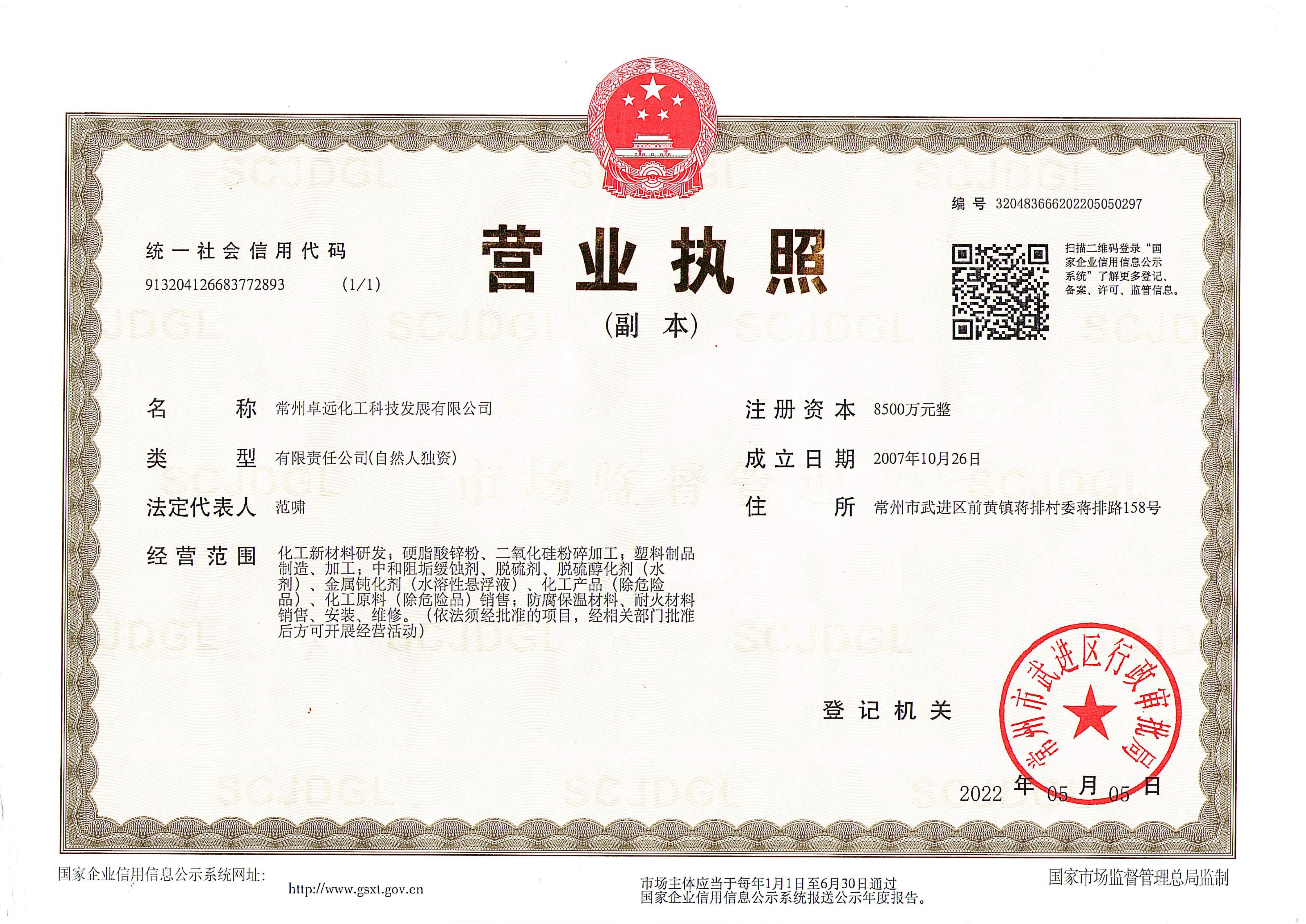 | 公司介绍 | 常州卓远化工科技发展有限公司,是集科研、生产、供应、销售为一体的综合企业。是中国中化、中国石化、中国石油一级供应商。下属公司分安徽、江苏两个生产基地。主营:炼油助剂、化工助剂、塑料制品,专业生产塑料编织袋、集装袋、聚乙烯吹塑薄膜及配套成型制袋内膜。公司拥有先进的生产设备和检验检测设备。我公司严格按照国标执行,并且已经全面通过ISO9001国际质量体系认证。现年产规模集装袋60万条。公司计划2026年再投入扩能增产,扩建食品级集装袋缝制车间,届时产能将达到120万条集装袋和相应配套的生产规模。目前公司产品已申报炼油产品发明专利实审通过15项、授权5项。炼油助剂系列产品的主要应用厂家如下:扬子石化、海南炼化、广州石化、九江石化、荆门石化、上海石化、上海赛科、中化泉州石化、山东正和集团、山东华星集团、山东昌邑石化、湖南石化、山东裕龙石化、淄博鑫泰石化、东营华联石化、东营联合石化、安庆石化、中科炼化。 |
