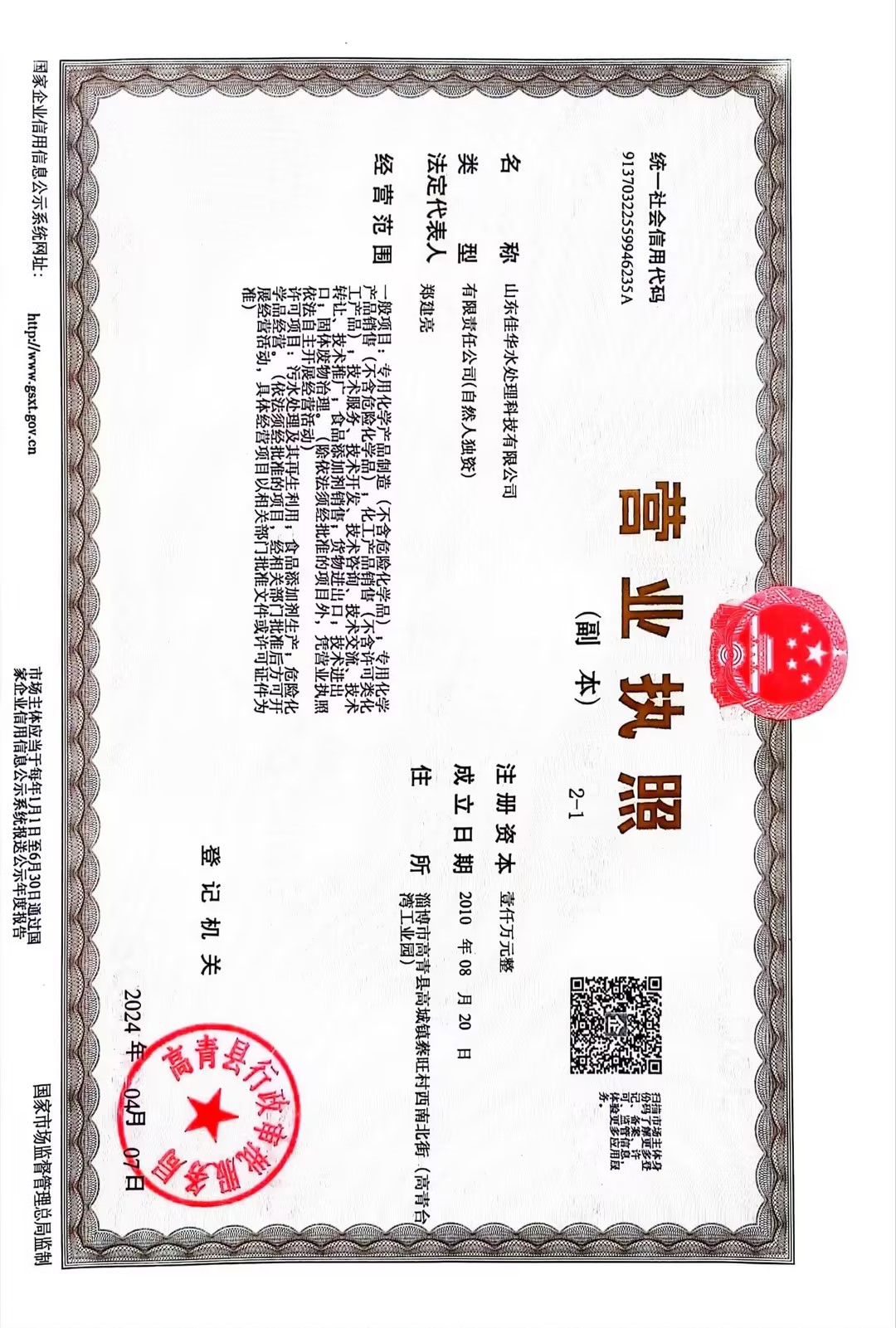 | 注册地址 | 山东 淄博市 高青县 | 法定代表人 | 郑建亮 | 注册资本 | 1000万人民币 |