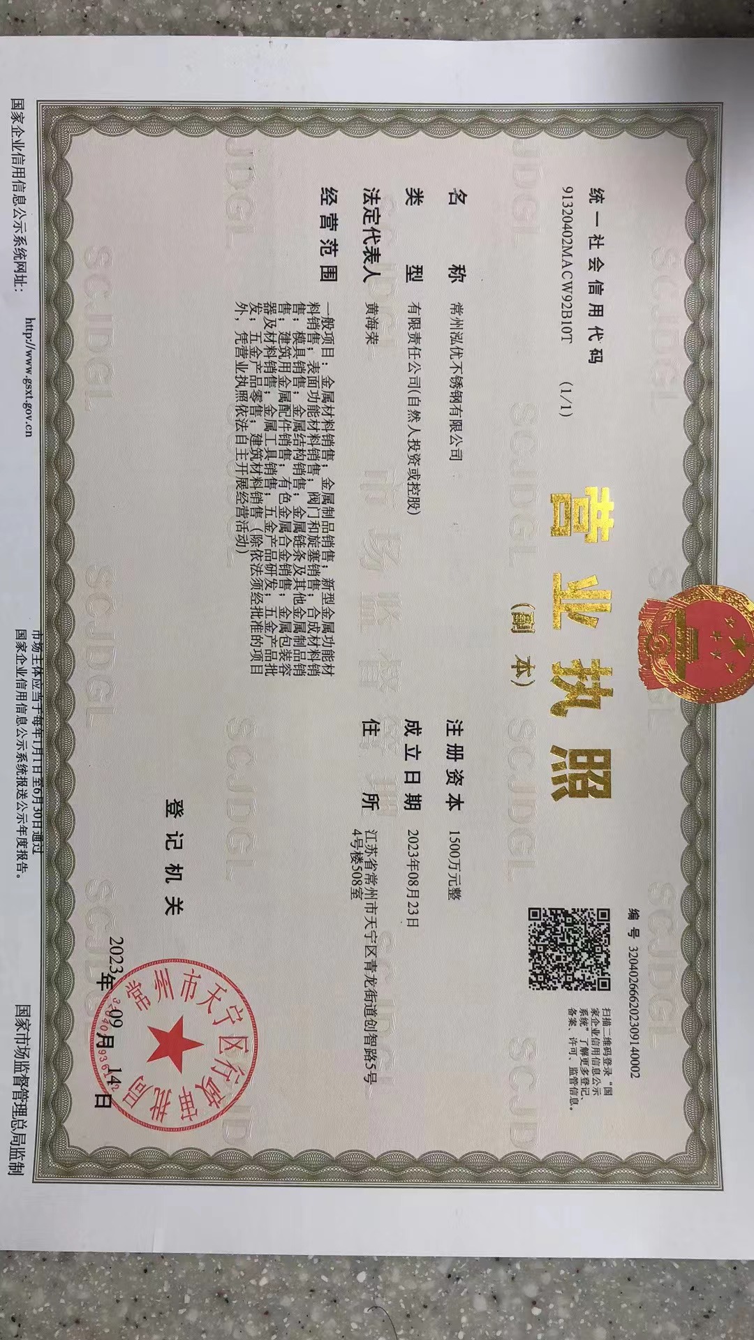 | 注册地址 | 江苏 常州市 天宁区 | 法定代表人 | 黄海荣 | 注册资本 | 1500万人民币 |