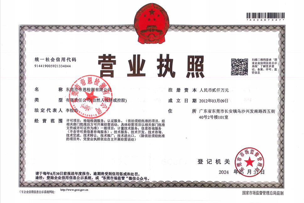 | 公司介绍 | 东莞市帝恩检测有限公司(简称“帝恩检测”), 成立于2012年,注册资本2000万元,是一家专业从事仪器计量校准、产品检测、检测认证及相关信息培训咨询的第三方计量单位,总部位于东莞,全国各地设立80多个办事处,员工总数1000+,其中技术人员200+。 帝恩检测校准实验室目前通过中国合格评定国家认可委员会(CNAS,认可证书编号L6483)仪器设备校准及检测项目共1105大项,认可范围覆盖电学、无线电、长度、力学、热学、理化、光学、电力、电气、洁净室、机械等多项专业领域;获得与CNAS签署互认多边协议国家及地区实验室认可机构的承认,所出具的校准证书得到国际实验室认可组织多边互认协议(ilac-MRA)其他成员的承认和认可,所出具的数据可溯源至国家计量基准和国际单位制(SI),所出具的证书、报告完全满足ISO/IEC17025和ISO9000的溯源性要求,完全满足企业ISO、IGP、CCC、CE等系列质量体系审查要求。 |