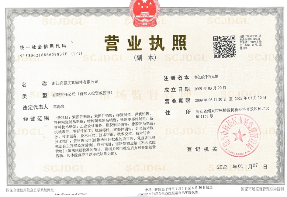 浙江高强度紧固件有限公司(股份制企业)致力于设计、研发、制造、检测专用级高强度紧固件、高温预紧碟形弹簧、军工专用弹簧系列等相关产品已30多年的历史。是全国紧固件标准化技术委员会委员单位、全国管路附件标准化技术委员会委员单位、全国压力容器标准化技术委员会压力管道安全分会委员单位、全国船用机械标准化技术委员会管系附件分委员会委员单位、中国热处理协会理事单位、中国企业家协会会员、中国企业家联合会会员。公司占地面积1.2万平方米,厂房面积1.4万平方米,注册资金1.2亿元,拥有各类先进生产及检测设备四百余台套,生产国标(GB)、美标(ANSI)、德标(DIN)、欧标(EN)、法国核电标准(RCCM-2007)、日标(JIS)、国际标准(ISO)行业标准(SH、HG、JB、GD、GJB)规格M12-M160、1/2"-6"高强度螺栓、螺母、螺柱(丝棒)及非标特殊紧固件,德标DIN2093、美标693F、20813、企标GQDH632-A碟形弹簧、军工专用弹簧系列产品。公司独立开发出高温预紧碟簧螺栓活压预紧技术、高强度核工业专用系列紧固件、耐低温抗腐蚀石油化工用系列紧固件、高强度抗腐蚀船舶机械用系列紧固件和高强度航空、航天系列紧固件,于2010年获得发明专利“特种紧固件的生产方法”,于2012年获得发明专利“核电螺栓生产工艺”,于2019年获得发明专利“一种卷簧制备方法”,于2020年获得发明专利“紧固件清洗干燥一体装置”,于2022年7月获得发明专利“一种高强度钢制造六角螺母及其加工工艺”,于2022年8月获得发明专利“一种核电站用紧固件”,于2023年3月获得发明专利“一种碟簧回火的防变形模压装置”,于2023年11月获得发明专利“一种轴系30CrNi3螺栓的滚压生产装置及其加工工艺”,于2024年4月获得发明专利“一种轴系薄螺母的固态润滑保养工艺”,迄今共获得50个实用新型专利。
