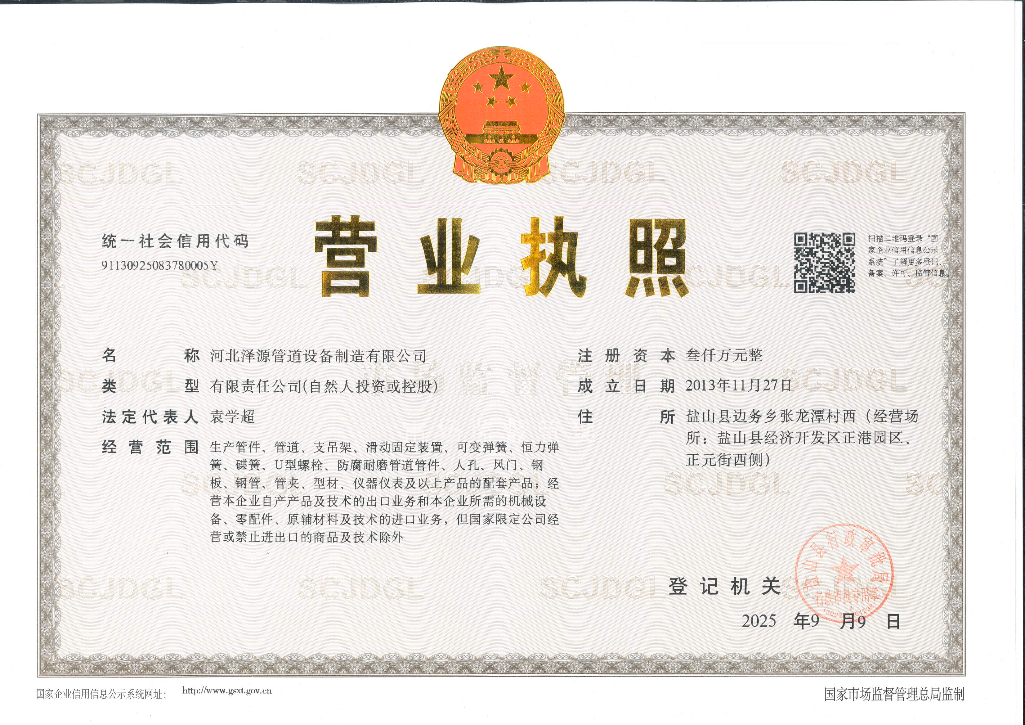 河北泽源管设备制造有限公司,始建于2013年,位于中国的“管道基地”——河北省沧州市盐山县。公司北依京津、东临黄骅港,交通十分便利,注册资金3000万元,员工总人数达96名。是专业生产滑动管托、导向管托,保冷管托、隔热管托、可变弹簧、恒力弹簧及相关配套的附件、连接件等各种系列产品。我公司已经取得国内、国际的质量管理体系以及行业中重要、权威的认证资质;我公司经过多年的经验,建立了企业自主创新体系,在同行业具有较强的竞争能力。