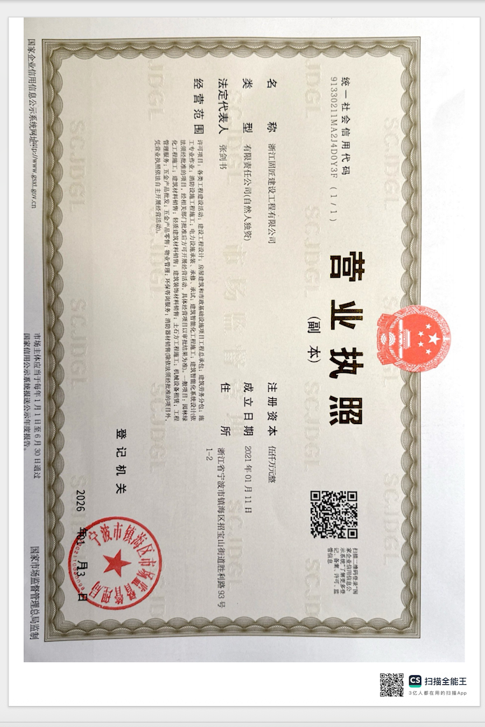 | 公司介绍 | 浙江固匠建设工程有限公司成立于2021-01-11,法定代表人为张剑书,注册资本为5000万元,统一社会信用代码为91330211MA2J4D0Y3F,企业注册地址位于浙江省宁波市镇海区招宝山街道胜利路93号1-2,所属行业为房屋建筑业,经营范围包含:许可项目:各类工程建设活动;建设工程设计;房屋建筑和市政基础设施项目工程总承包;建筑劳务分包;施工专业作业;消防设施工程施工;电力设施承装、承修、承试;建筑智能化工程施工;建筑智能化系统设计(依法须经批准的项目,经相关部门批准后方可开展经营活动,具体经营项目以审批结果为准)。一般项目:园林绿化工程施工;建筑材料销售;轻质建筑材料销售;建筑装饰材料销售;土石方工程施工;机械设备租赁;工程管理服务;五金产品批发;五金产品零售;物业管理;环保咨询服务;消防器材销售(除依法须经批准的项目外,凭营业执照依法自主开展经营活动)。企业当前经营状态为存续。 |