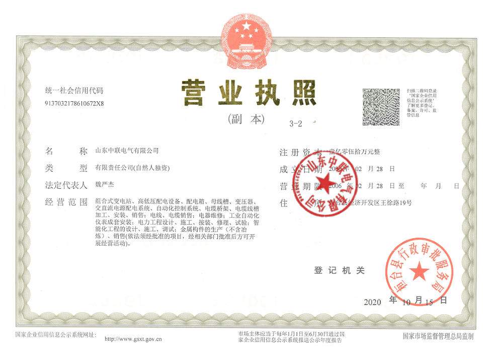 | 经营范围 | 组合式变电站、高低压配电设备、配电箱、母线槽、变压器、交直流电源配电系统、自动化控制系统、电缆桥架、电缆线槽加工、安装、销售;电线、电缆销售;电器维修;工业自动化仪表成套安装;电力工程设计、施工、按装、修理、试验;智能化工程的设计、施工、调试;金属构件的生产(不含冶炼)、销售(依法须经批准的项目,经相关部门批准后方可开展经营活动)。 | ||||