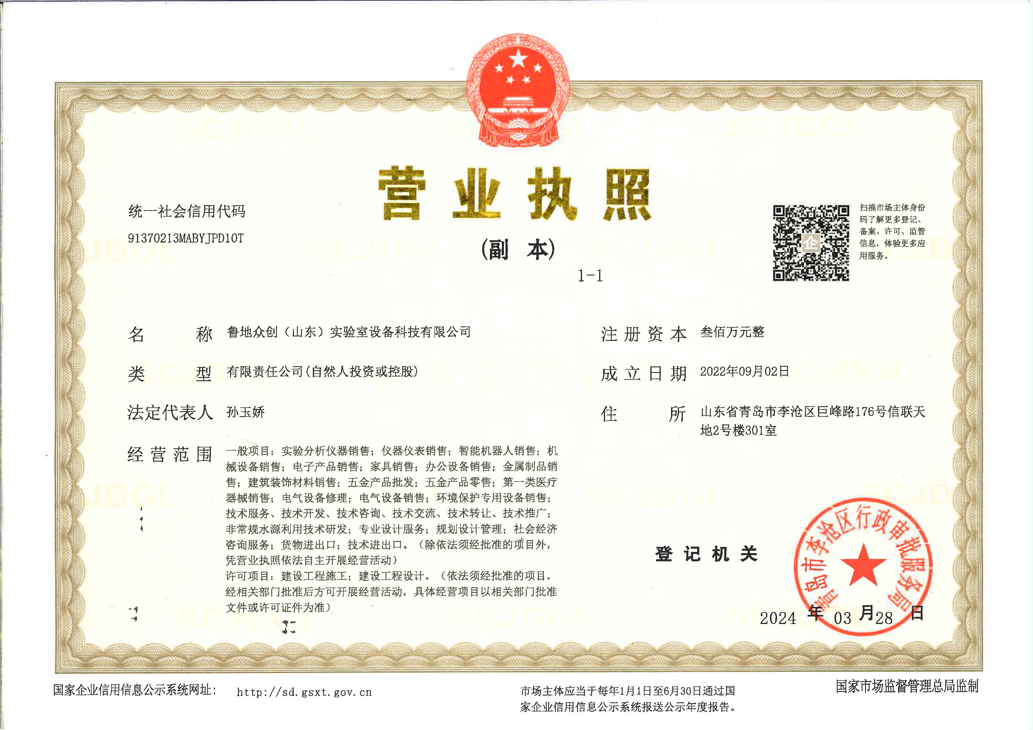 | 注册地址 | 山东 青岛市 | 法定代表人 | 孙玉娇 | 注册资本 | 300万人民币 |