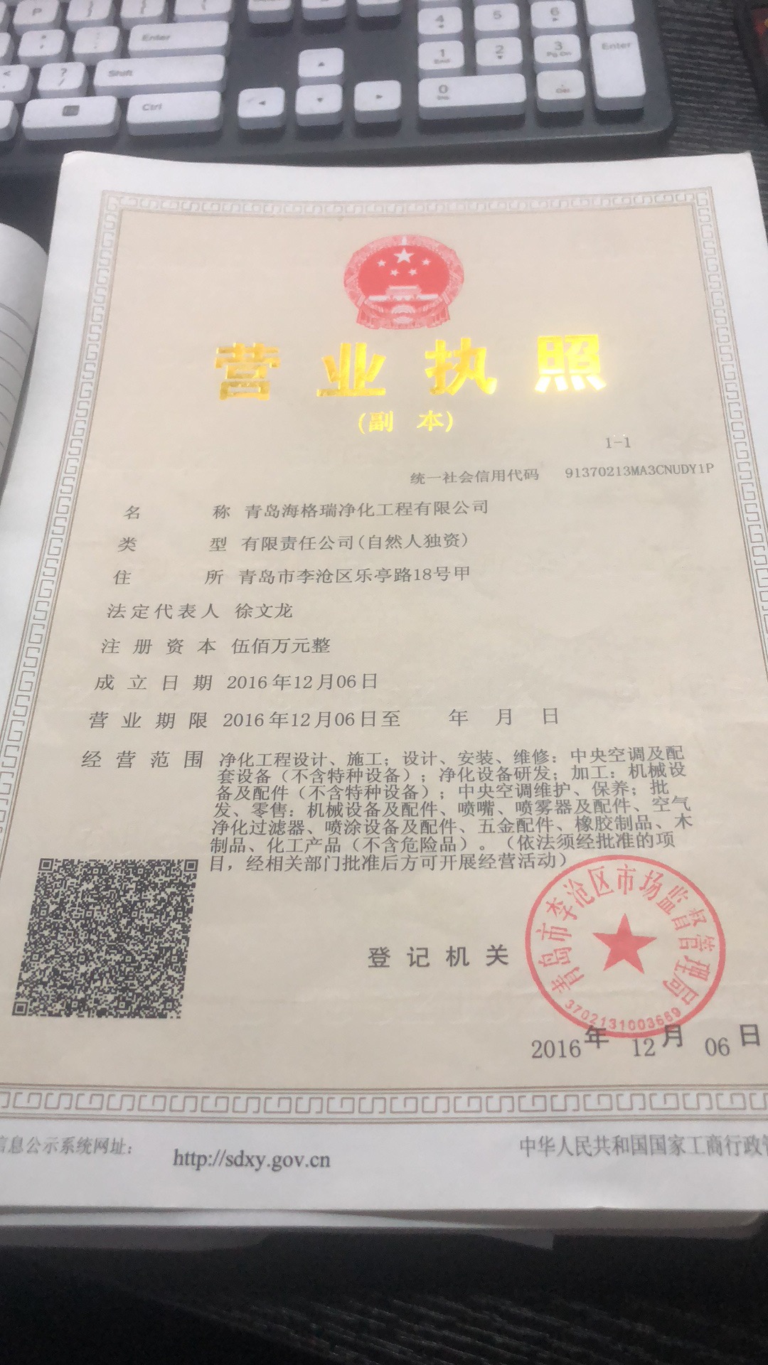 | 注册地址 | 山东 青岛市 李沧区 | 法定代表人 | 徐文龙 | 注册资本 | 500万人民币 |