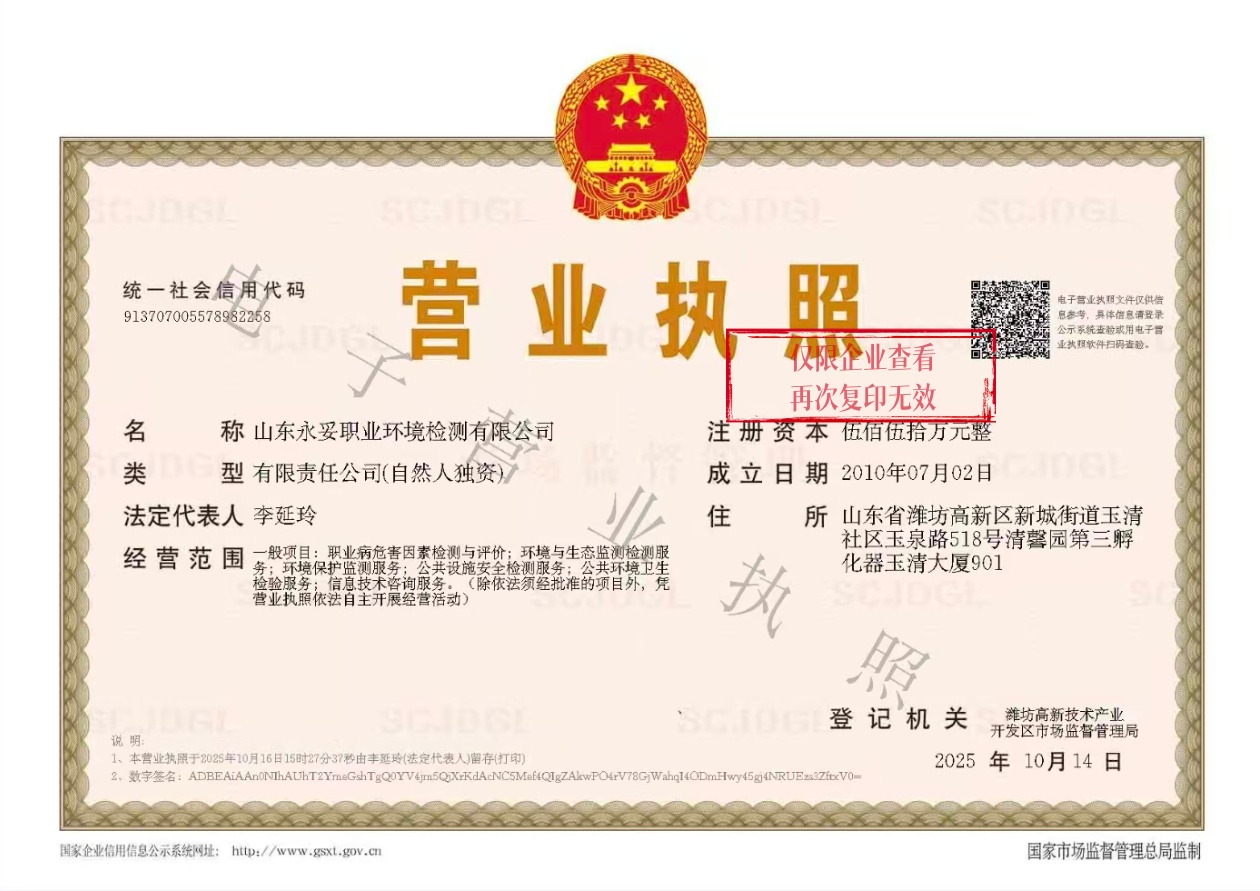 山东永妥职业环境检测有限公司,成立于2010年7月,总部位于山东潍坊高新区第三孵化器玉清大厦901室(玉清东街与玉泉路口清馨园),服务范围覆盖潍坊市及周边地区。
