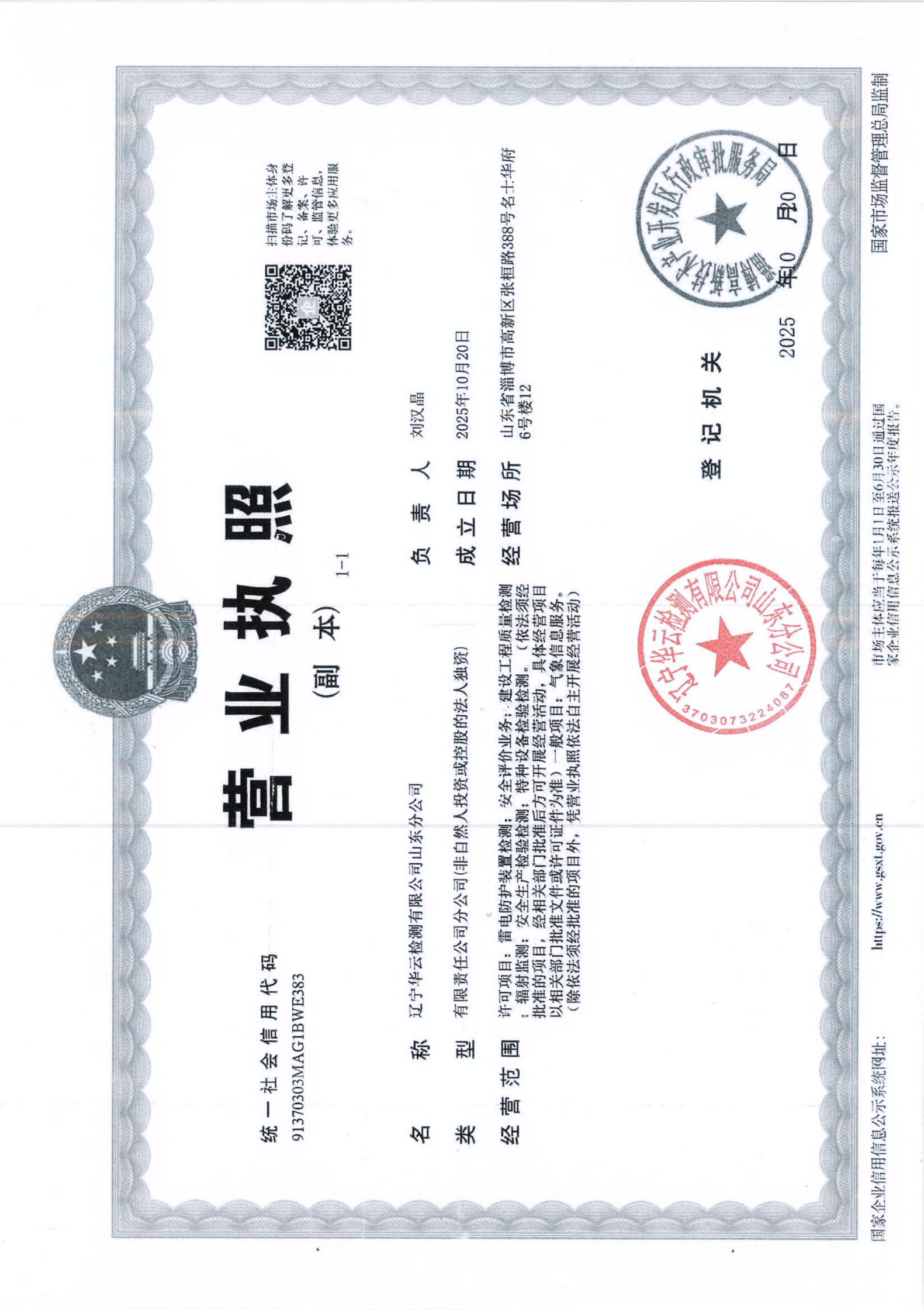 辽宁华云检测有限公司山东分公司为辽宁华云检测有限公司下属分公司于2025年10月正式挂牌成立,辽宁风云科技服务有限公司在2016年3月成立,取得了由辽宁省气象局颁发的防雷检测甲级资质证书、经质量技术监督局授权的CMA计量认证“具有向社会出具证明作用的数据和结果”的第三方检测机构,保证检测数据的公正性、科学性、准确性,遵守“质量第一、服务高效、数据准确、行为公正、作风严谨、科学管理”的制度,严格按照质量手册及程序文件运行,符合国家级实验室要求的防雷装置和防雷产品的检测机构。