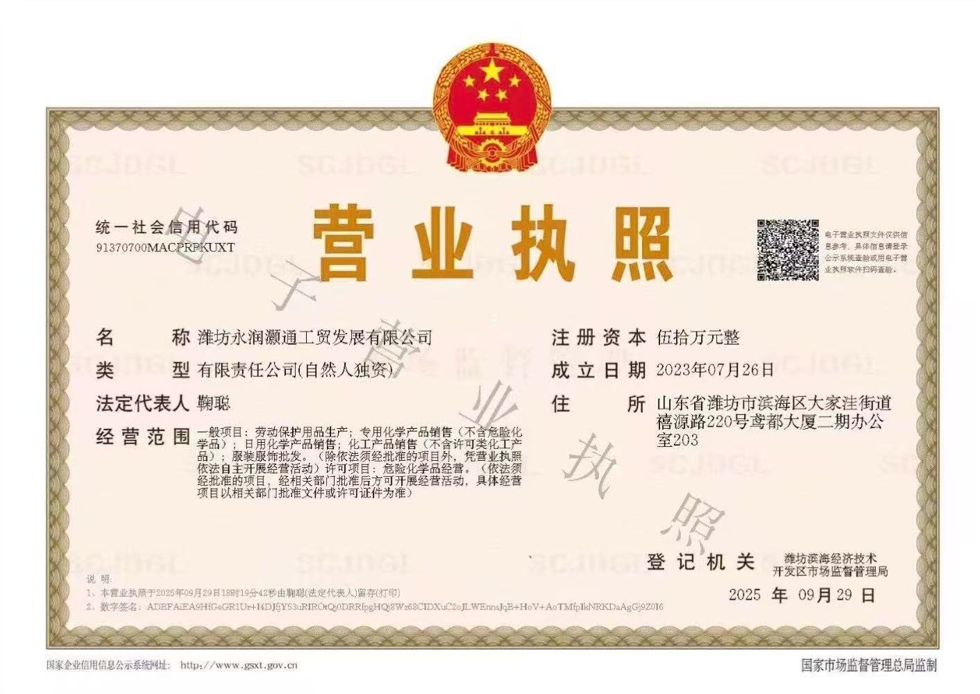 | 注册地址 | 山东 潍坊市 寒亭区 | 法定代表人 | 鞠聪 | 注册资本 | 50万人民币 |