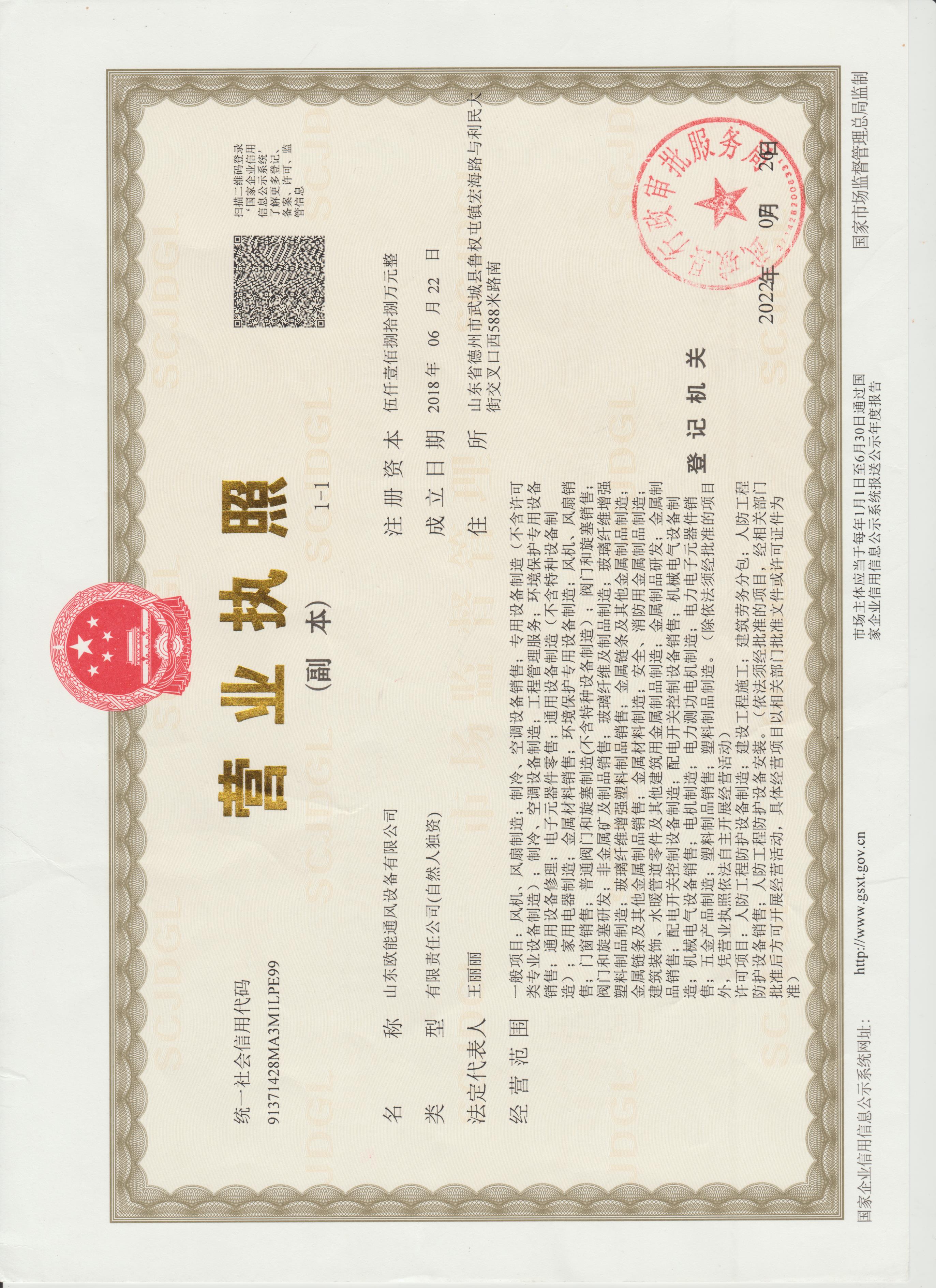 | 经营范围 | 山东欧能通风设备有限公司是一家专业集通风排烟系统、工程安装、风冷设备设计、研发销售及维护为一体的现代化企业本公司产品主要有:中央空调系统、净化空调系统及配套产混流风机、离心风机、铝合金风口、消声器、静压箱、水箱、品、消防排烟风机、排烟防火阀、冷却塔、通风管道 | ||||